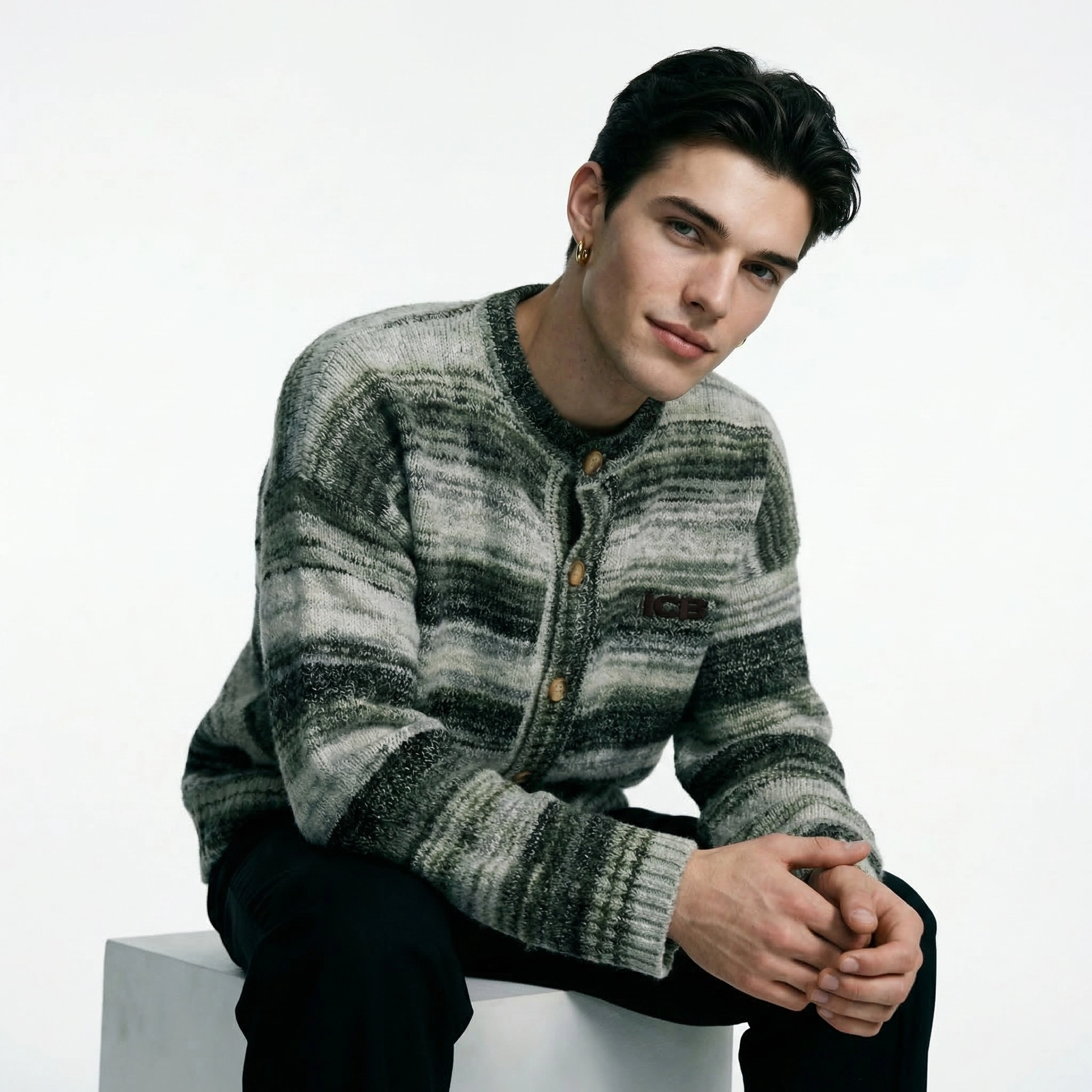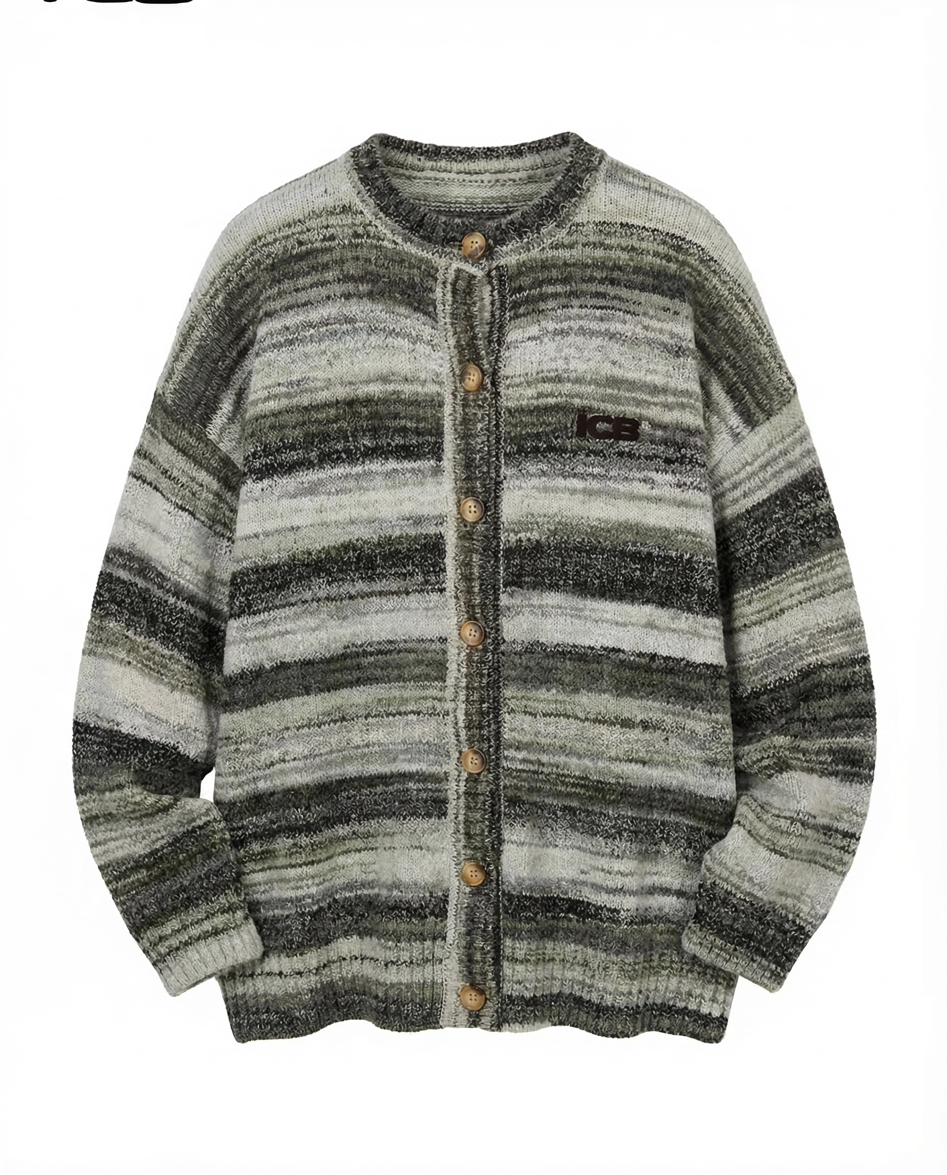 سويتر كاردigan مزخرف بخطوط متدرجة عتيقة | جاكيت بأزرار خشبية فضفاضة للرجال | سويتر مطرز بأسلوب كسول ICB