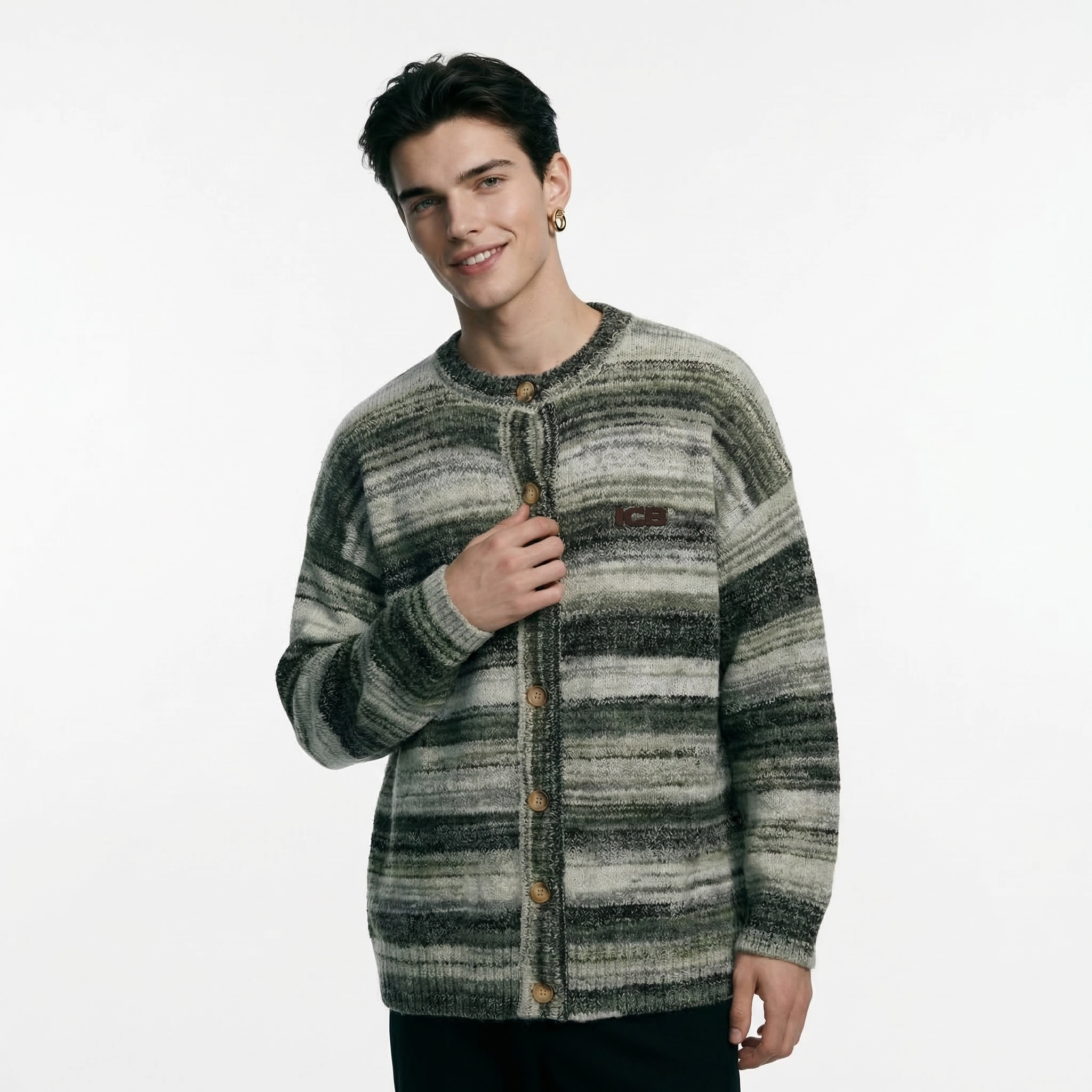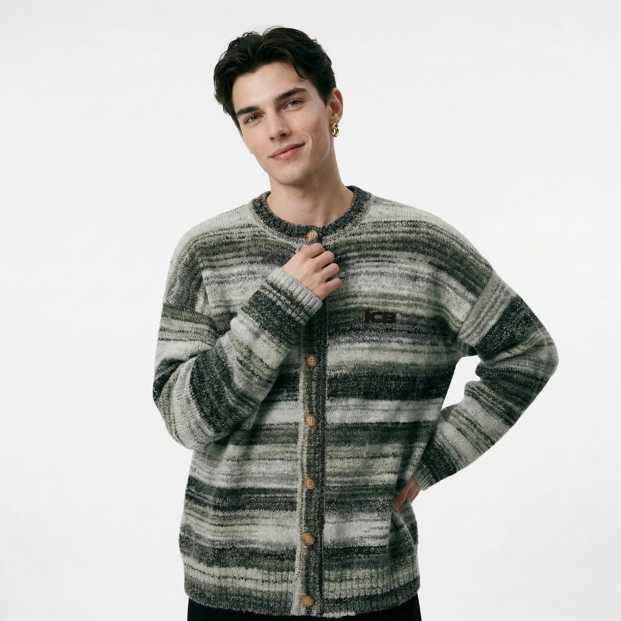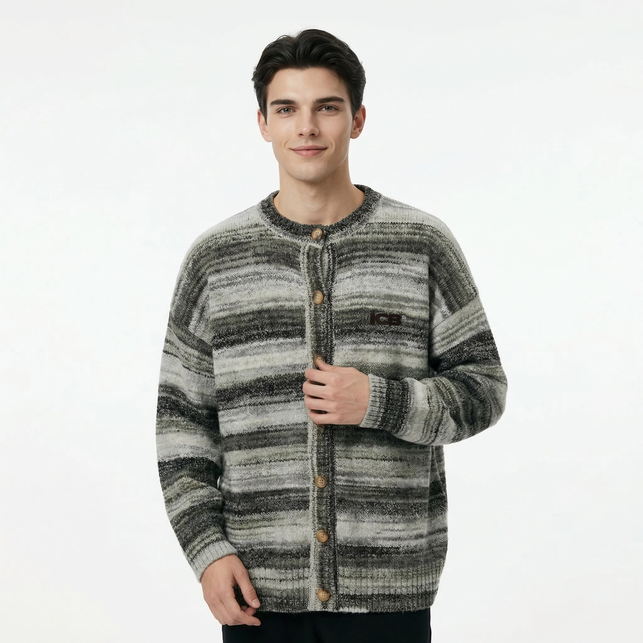 يتميز هذا الكاردigan الرجالي بتصميم خطوط متدرجة عتيقة، مع خطوط مختلطة باللون الرمادي والأخضر تعكس أجواء كسولة. العنق الدائري وزر الأزرار الخشبية تصميم كلاسيكي وسهل الارتداء؛ الشكل الفضفاض مع الأكتاف المنسدلة يناسب جميع أنواع الجسم، مما يوفر تغطية وتأثير نحيف. مصنوع من قماش صوف مختلط ناعم وصديق للبشرة، له لمسة دافئة ورقيقة، وقابل للتنفس وغير خانق، ويعمل بشكل جيد للتنسيق في الشتاء أو ارتدائه بمفرده في الربيع والخريف. تضيف علامة ICB المطرزة على الصدر الأيسر تفاصيل دقيقة، مما يجعله مثالياً لإنشاء مظهر عصري غير رسمي يومي، سواء للتنقل اليومي أو الخروج في عطلة نهاية الأسبوع أو التجمعات غير الرسمية.
