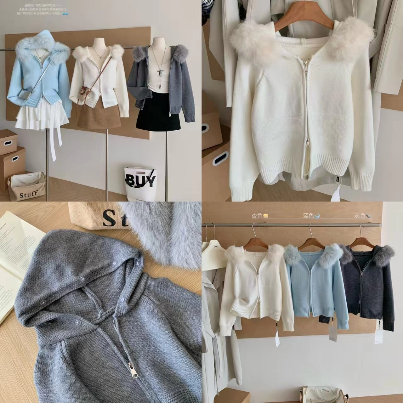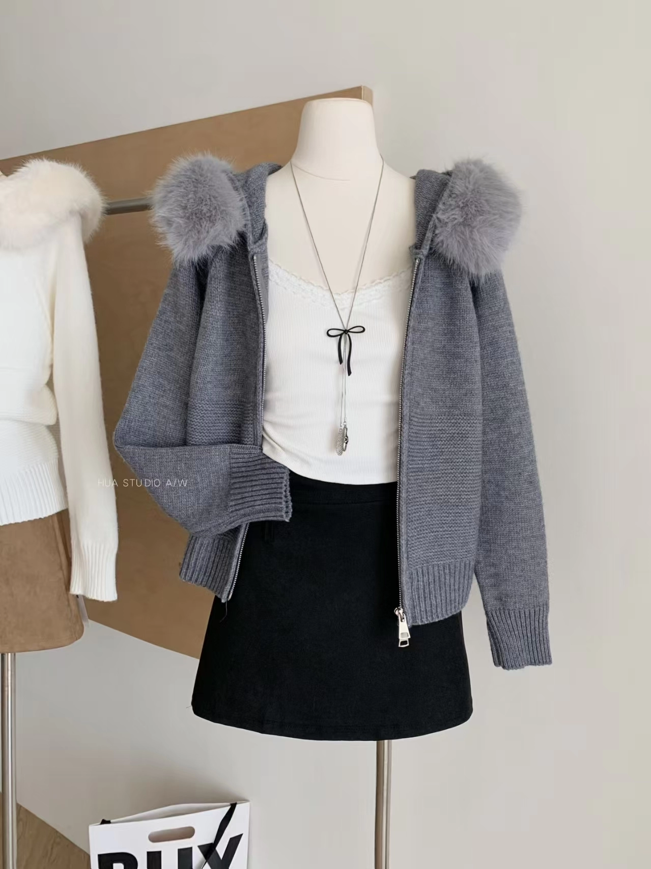 This knit cardigan embodies a chic, Korean-inspired relaxed aesthetic. Featuring a detachable genuine fox fur hood, an oversized silhouette, and statement hardware, it masterfully blends cozy comfort with a touch of understated luxury, perfect for effortless autumn and winter styling.