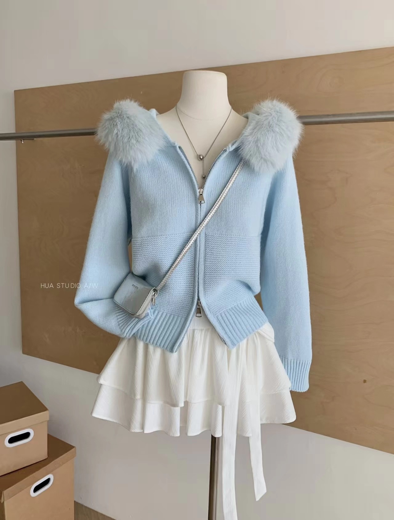 Introducing the HUA STUDIO Autumn-Winter collection featuring a relaxed fox fur knit cardigan. This luxurious piece seamlessly combines a sexy allure with a laid-back comfort. Crafted from high-quality soft knit fabric, it offers a gentle touch and good elasticity. The loose and moderate fit embodies the "relaxed" aesthetic - neither tight nor cumbersome, it can skillfully highlight the soft curves of the body while ensuring all-day comfort. The highlight is the detachable genuine fox fur collar, which not only adds a luxurious touch and warmth but also enhances the overall style with an elegant touch. The matching contrasting metal double-headed zipper ensures smooth opening and closing, creating a sharp visual contrast with the color of the cardigan, and enhancing the design sense. The cuff with ribbing fits snugly around the wrist, effectively blocking the cold wind from entering, while maintaining both practicality and aesthetics. Available in versatile neutral colors such as apricot and blue, it is easy to switch between casual and sophisticated styles. Pair with a halter dress for a sexy date look, combine with high-waisted jeans and a base layer vest to create a laid-back daily vibe, or layer over a high-neck sweater to cope with cold weather. This cardigan combines the elements of allure, comfort, and luxury, making it a unique and personalized item that showcases your distinctive taste in your autumn wardrobe.