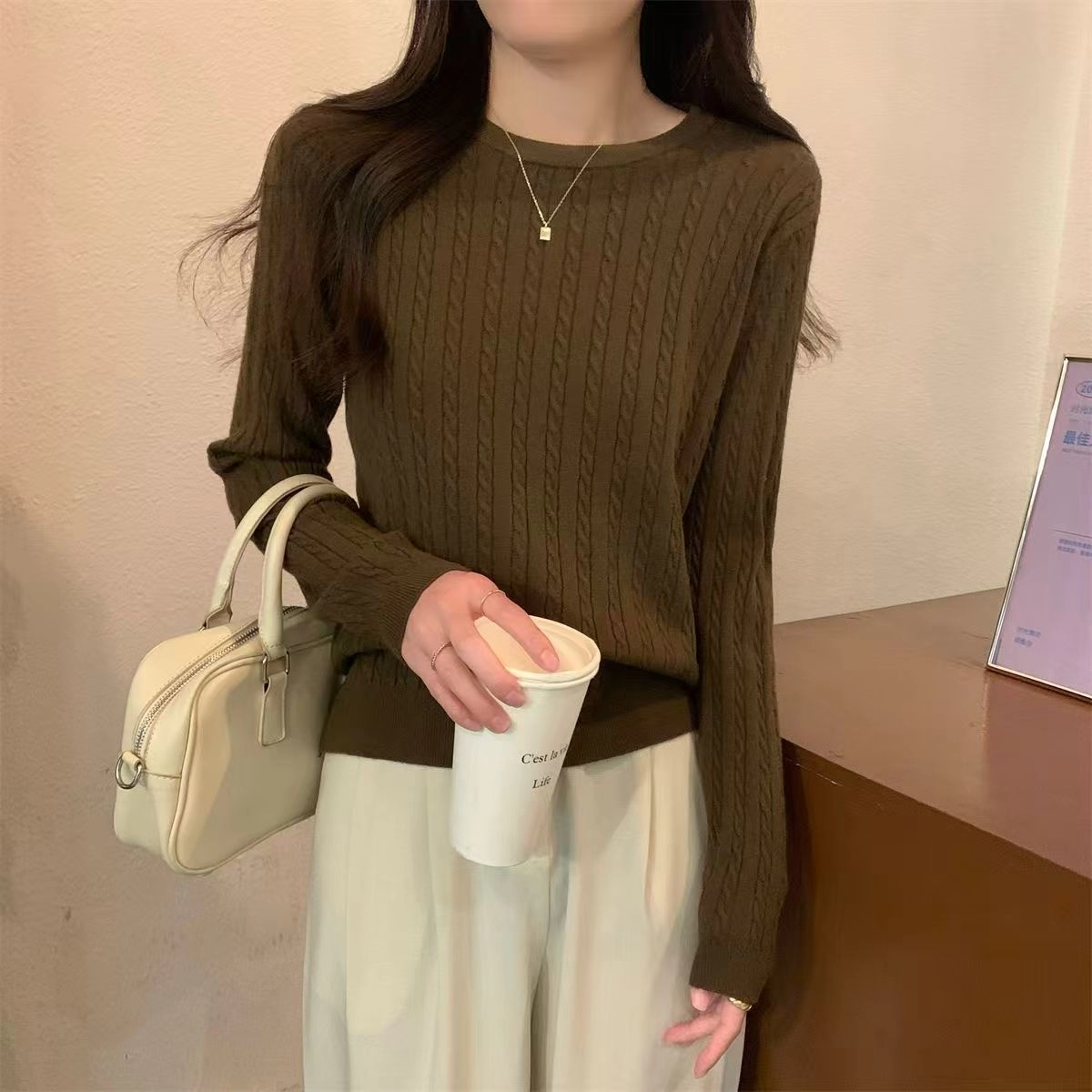 Introducing our Core-Spun Yarn Crew Neck Knit Base Layer, a versatile and charming piece designed for women to embrace comfort and preppy style during spring and autumn. Crafted from high-quality core-spun yarn, this sweater boasts a soft, fluffy texture with excellent elasticity and durability—featuring a skin-friendly touch that avoids irritation even for sensitive skin. The classic crew neck design flatters the neckline and fits seamlessly under outerwear, while the intricate cable-knit pattern adds retro texture and depth, enhancing the preppy aesthetic. With a cropped length and loose fit, it effortlessly elongates the waistline and pairs perfectly with high-waisted bottoms, creating a lively and youthful vibe. Available in timeless solid colors, this long-sleeve sweater balances warmth and breathability, making it ideal for standalone wear or layering. Whether matched with pleated skirts and loafers for a classic preppy look, paired with jeans and sneakers for casual daily style, or layered under cardigans/coats for transitional weather, it combines practicality with fashion—becoming an essential staple in your spring and autumn wardrobe that exudes effortless charm.