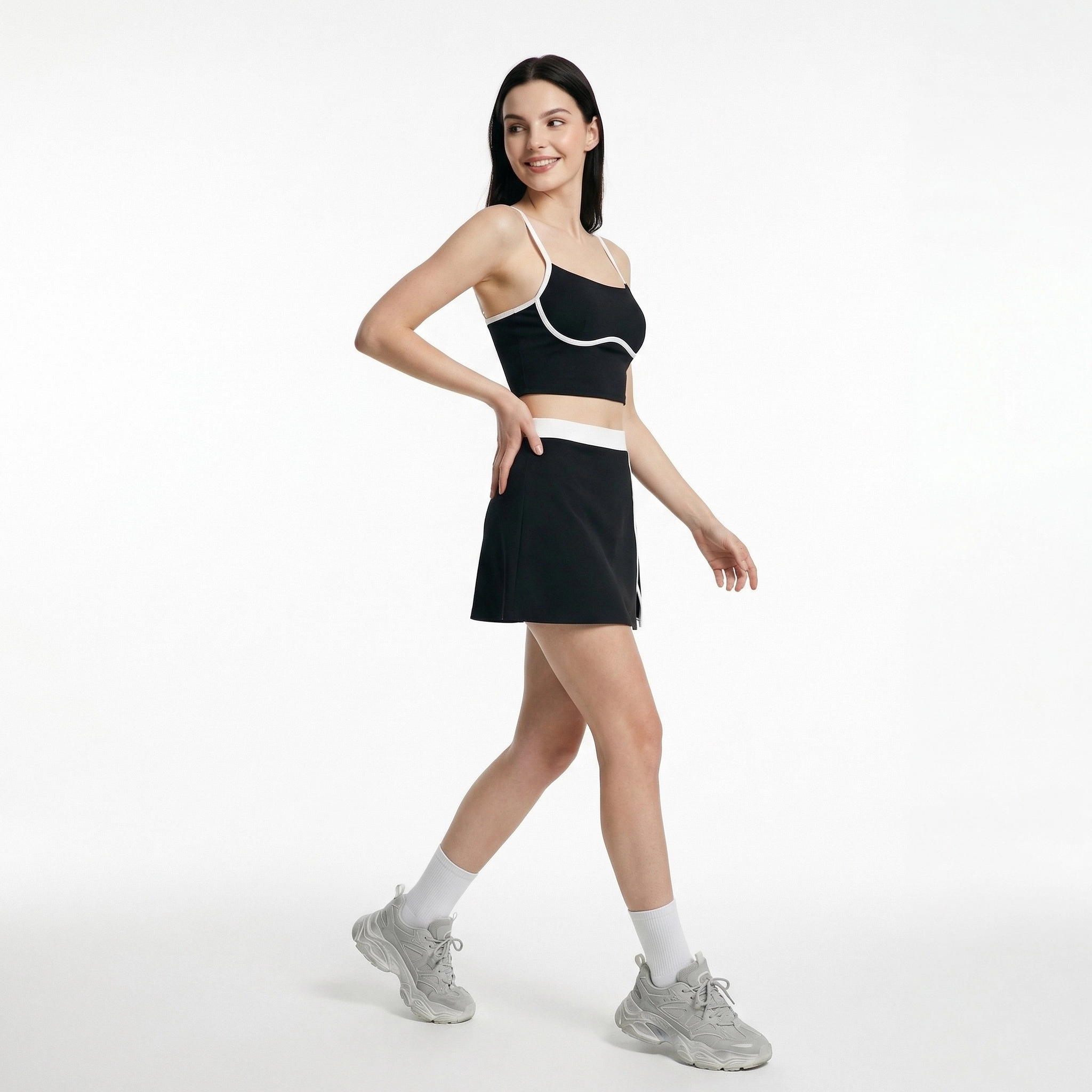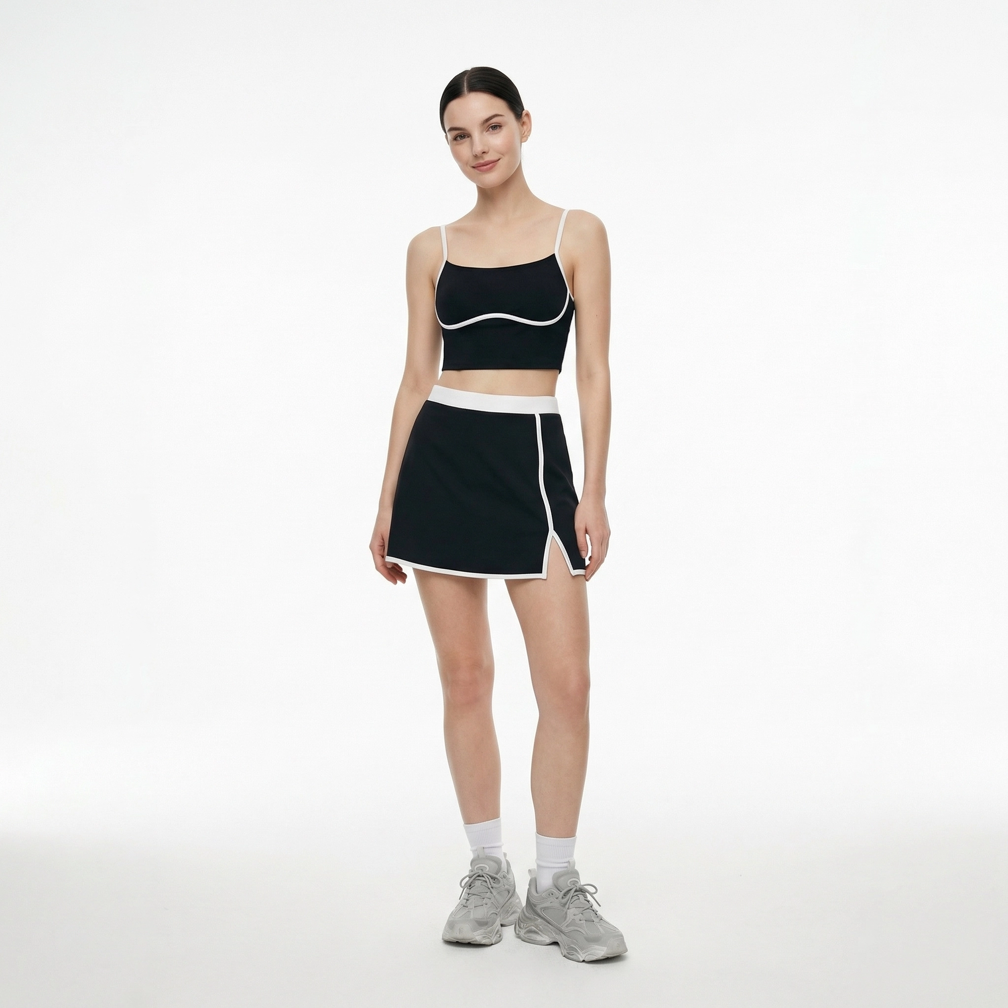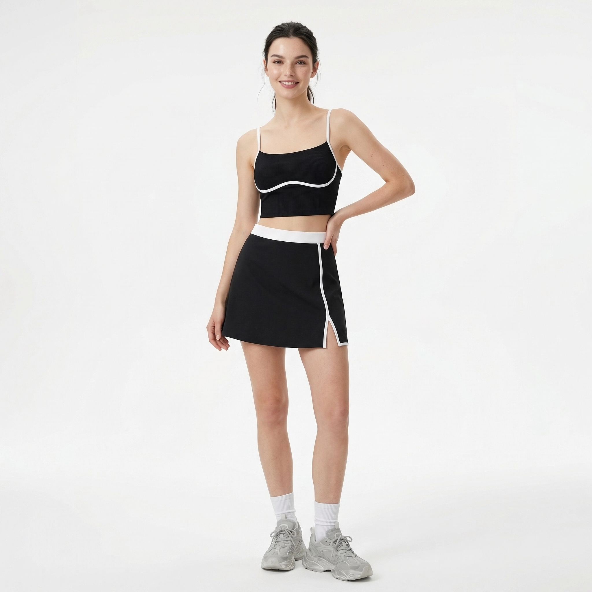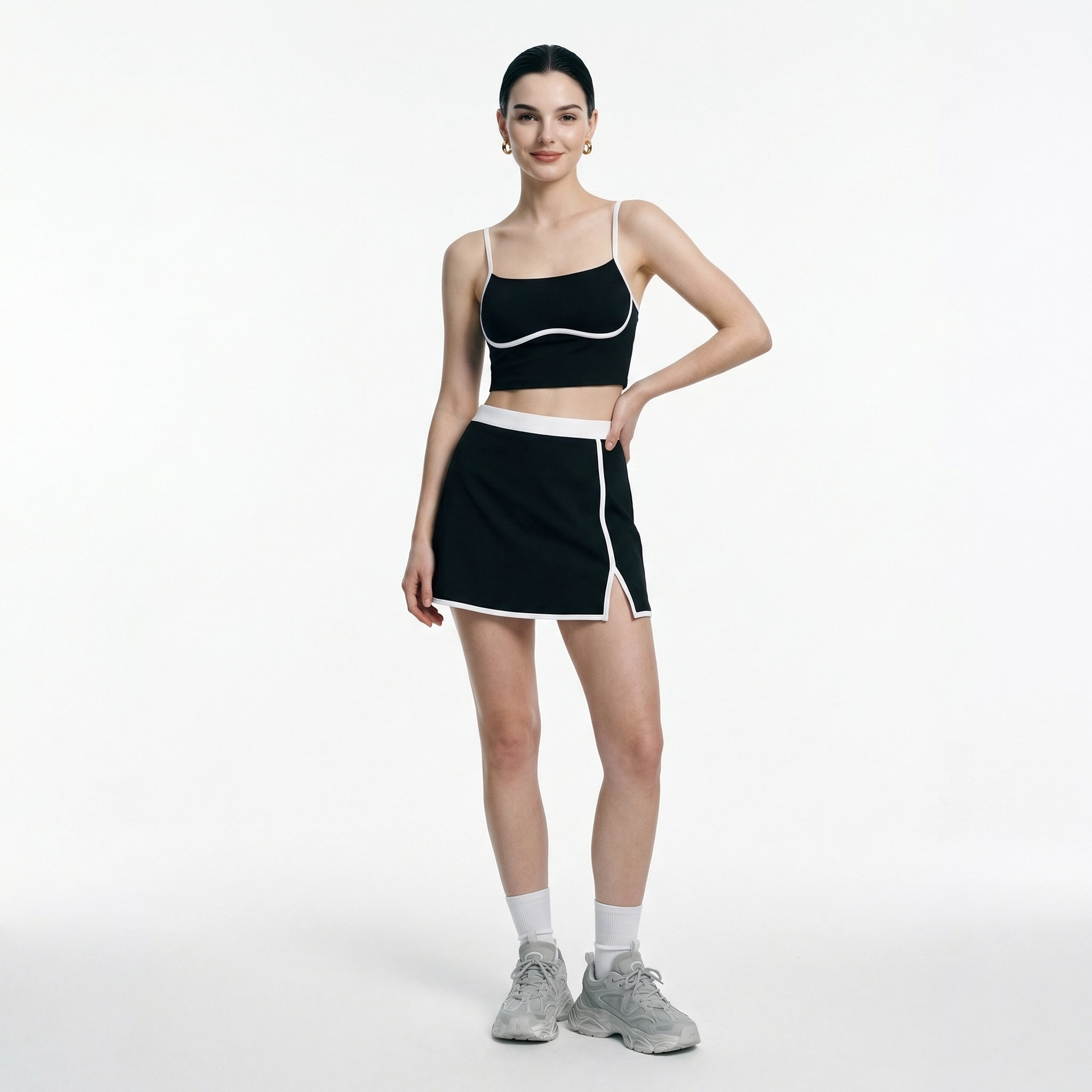 This black and white color block 2-piece sports set is crafted for active daily life and sports scenarios. The top features thin spaghetti straps with color block piping, which neatly outline the neck and shoulder lines, and a cropped cut to expose the waistline for a refreshing and tall look. The bottom is a split skort style: the outer skirt layer ensures aesthetics, while the inner shorts prevent exposure. The white waistband and side color block lines echo the top, creating a sweet, cool and vibrant overall style. Made of high-stretch quick-dry knitted fabric, it is skin-friendly, breathable and highly stretchy. It is suitable for sports scenarios such as tennis and fitness, as well as daily commuting and casual outings, balancing practicality and fashion.