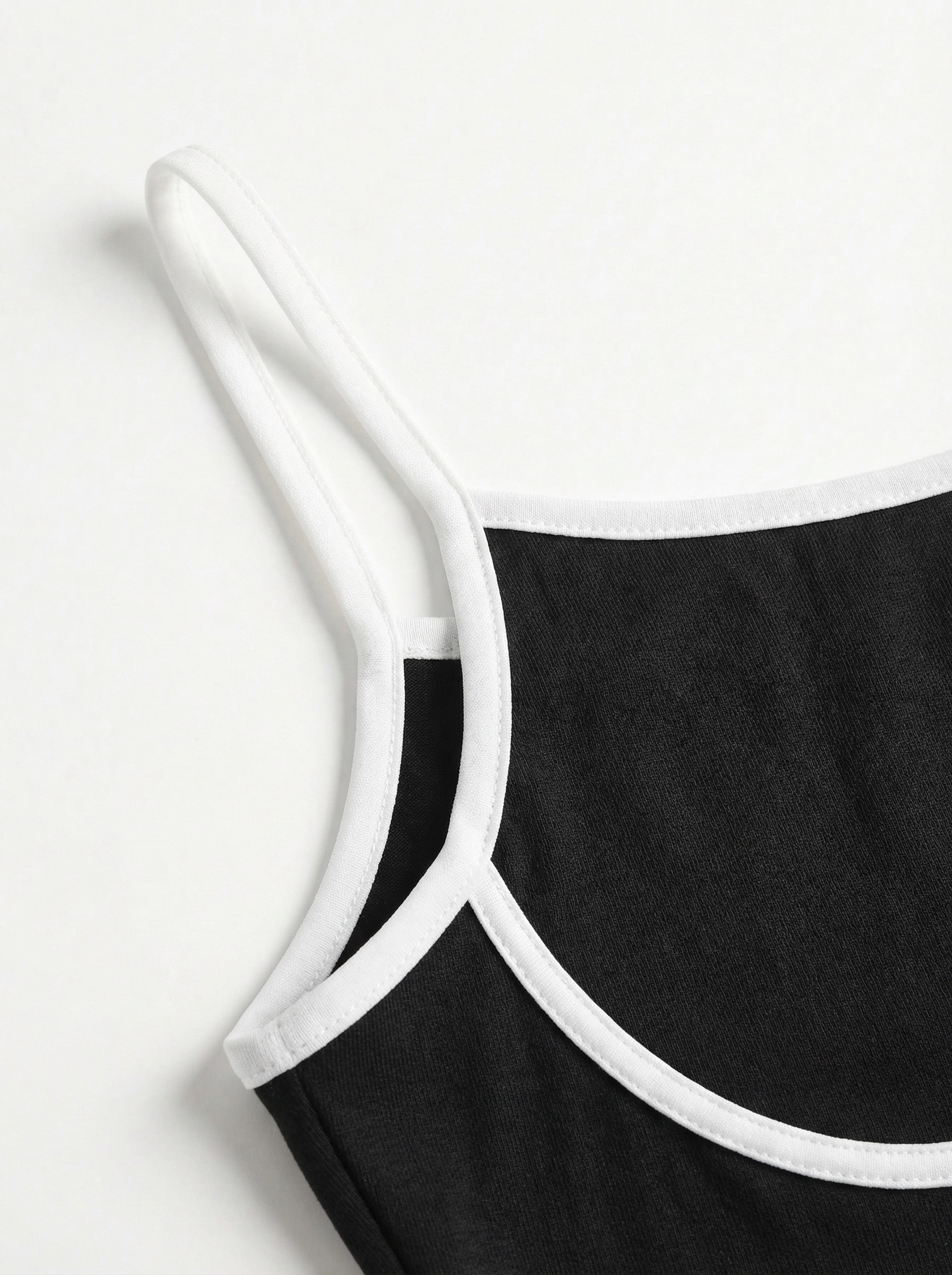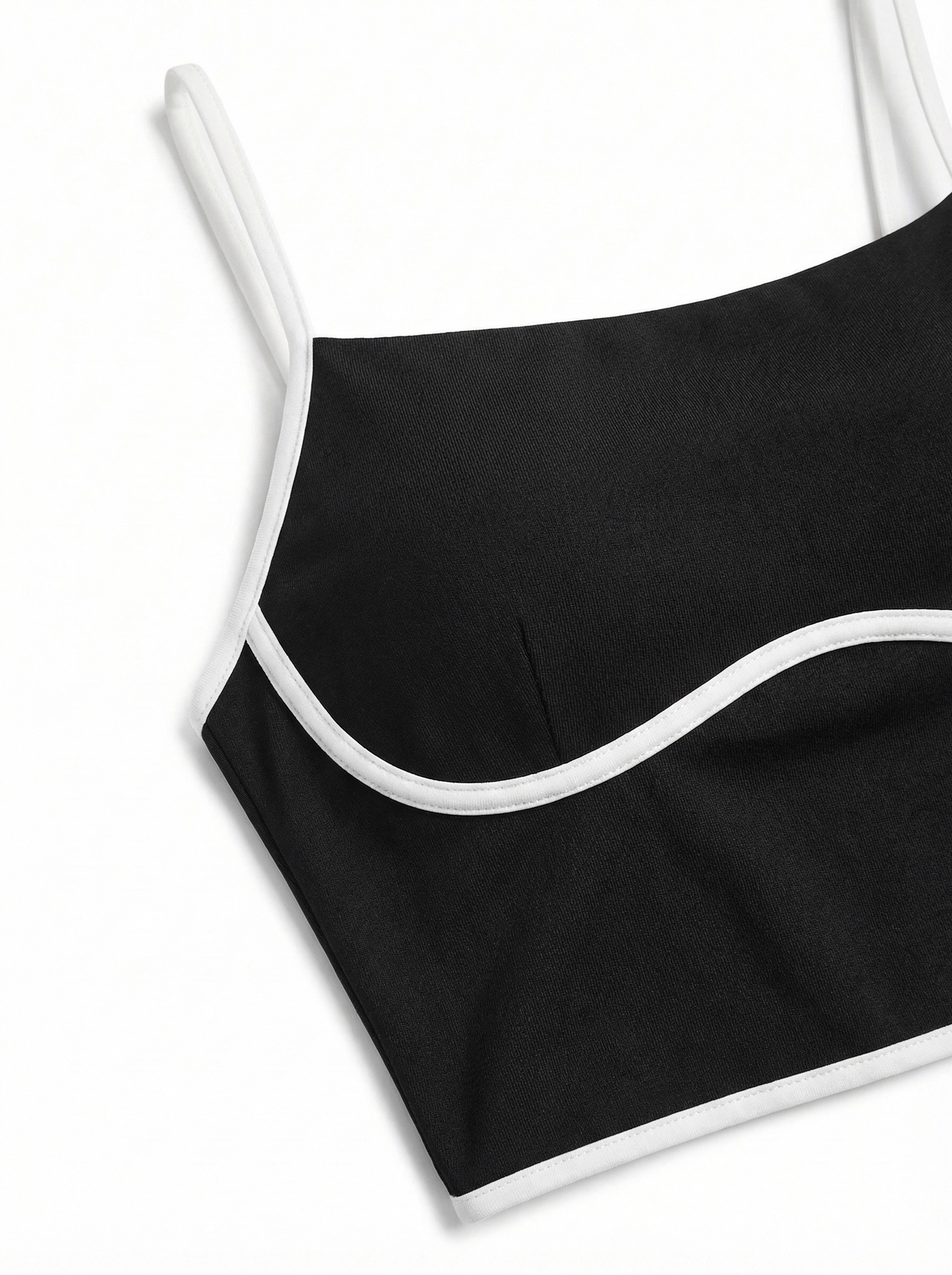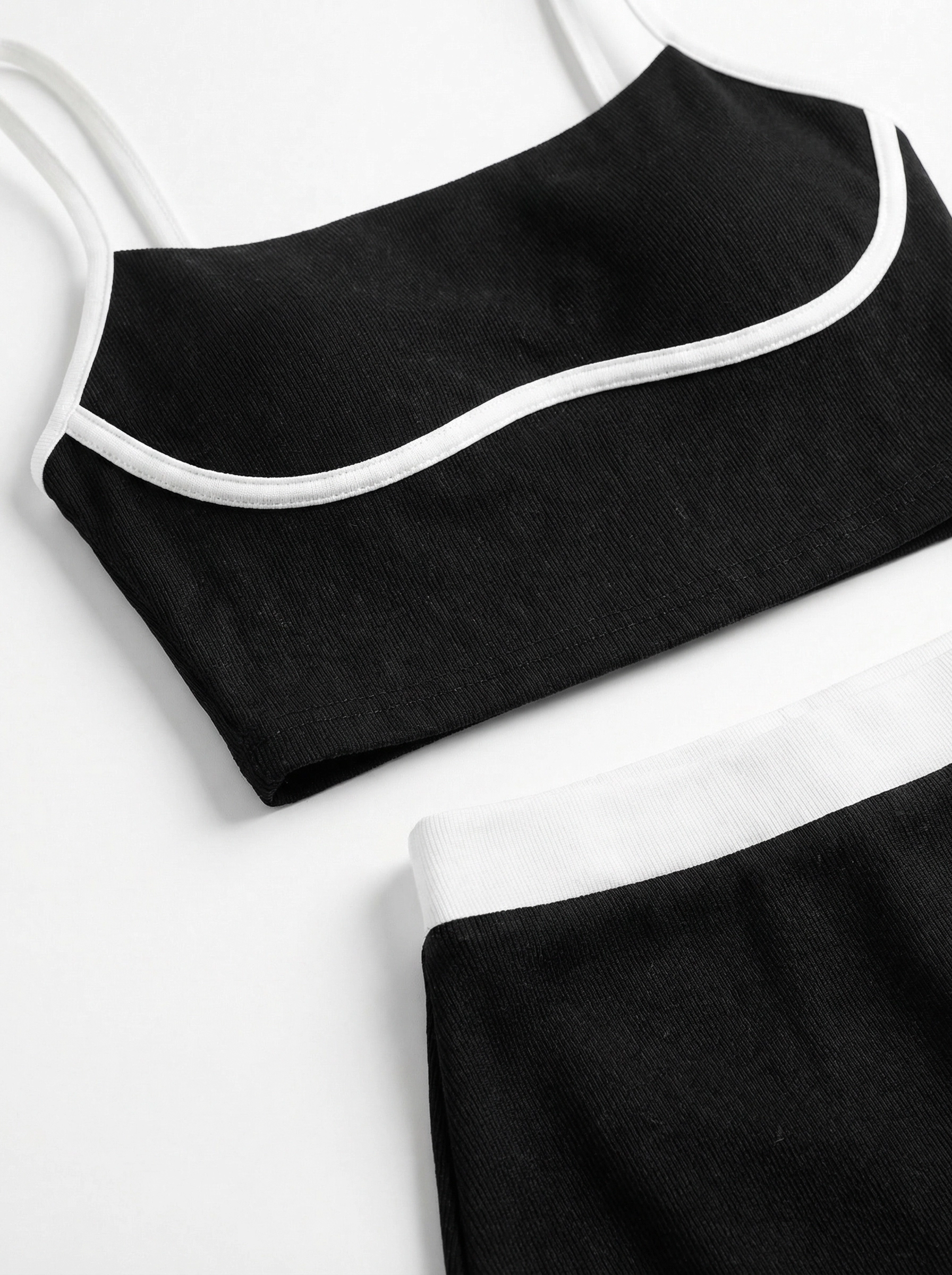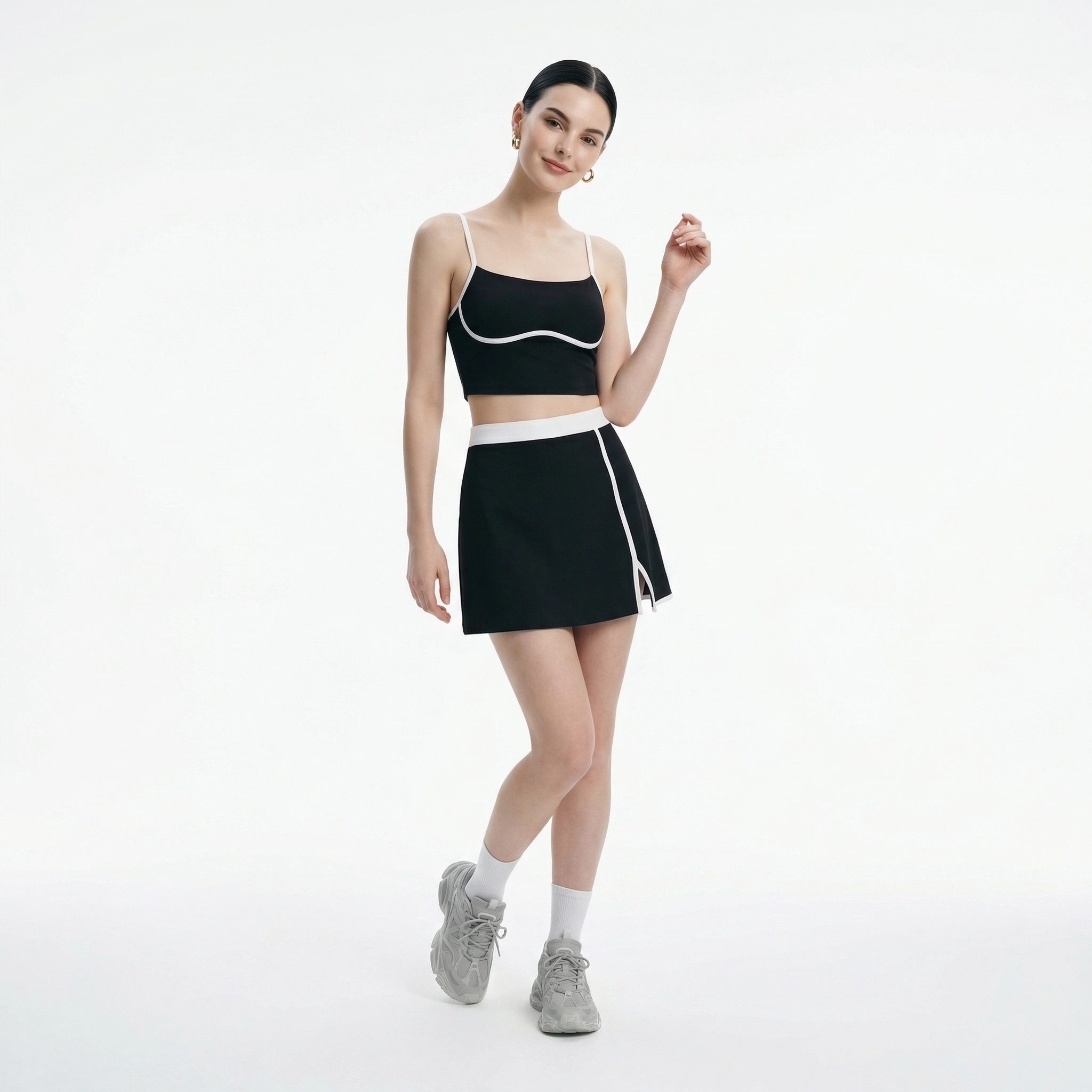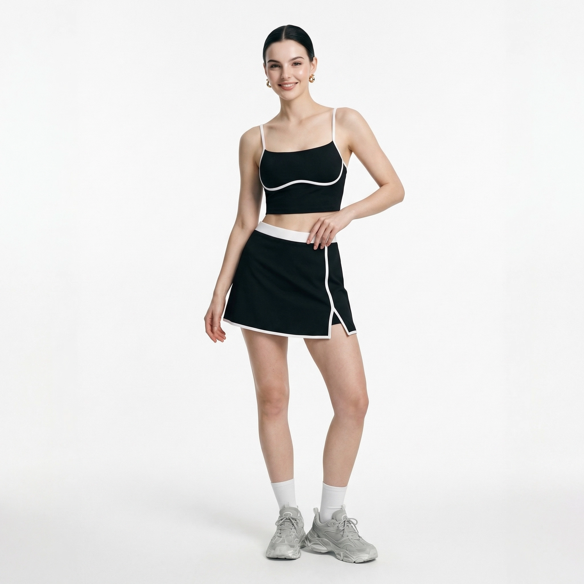 This black and white color block 2-piece sports set is crafted for active daily life and sports scenarios. The top features thin spaghetti straps with color block piping, which neatly outline the neck and shoulder lines, and a cropped cut to expose the waistline for a refreshing and tall look. The bottom is a split skort style: the outer skirt layer ensures aesthetics, while the inner shorts prevent exposure. The white waistband and side color block lines echo the top, creating a sweet, cool and vibrant overall style. Made of high-stretch quick-dry knitted fabric, it is skin-friendly, breathable and highly stretchy. It is suitable for sports scenarios such as tennis and fitness, as well as daily commuting and casual outings, balancing practicality and fashion.