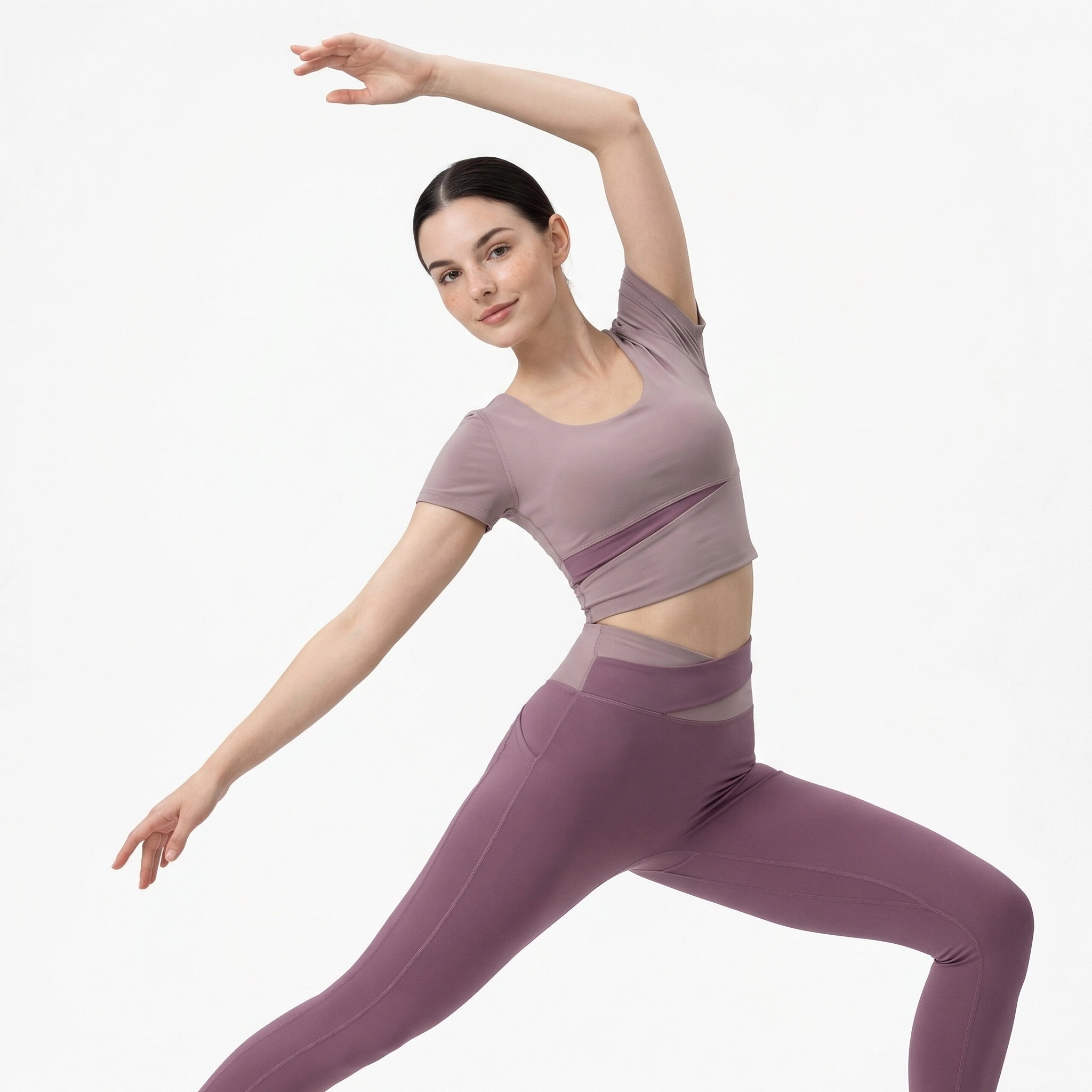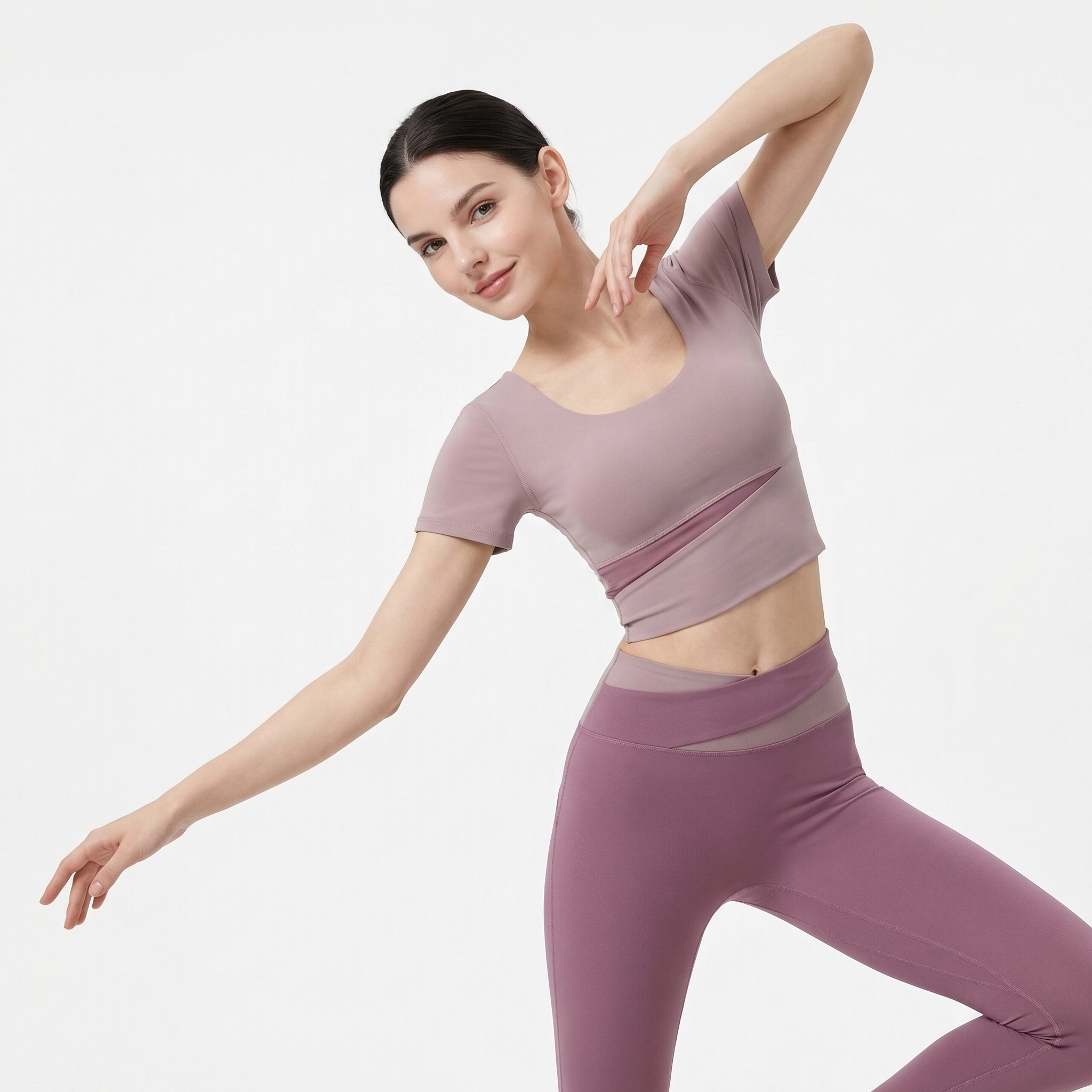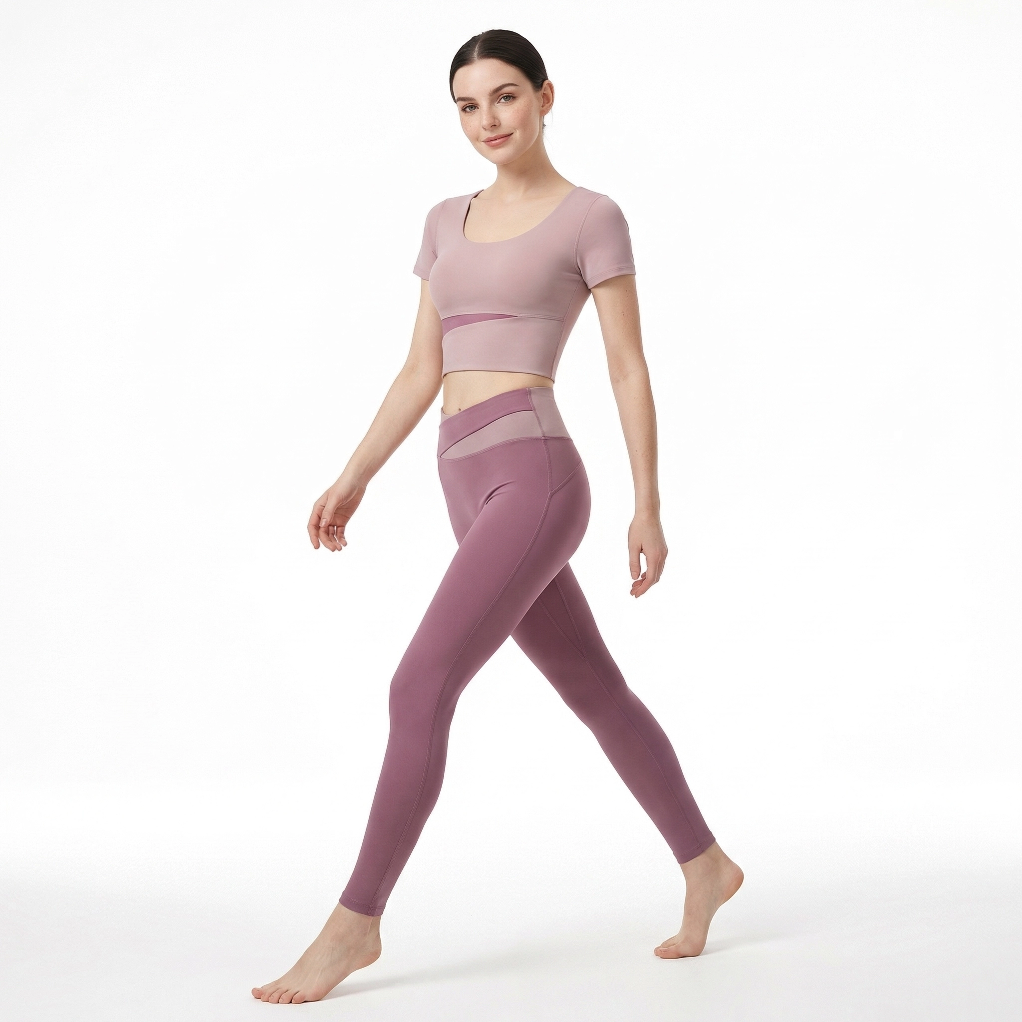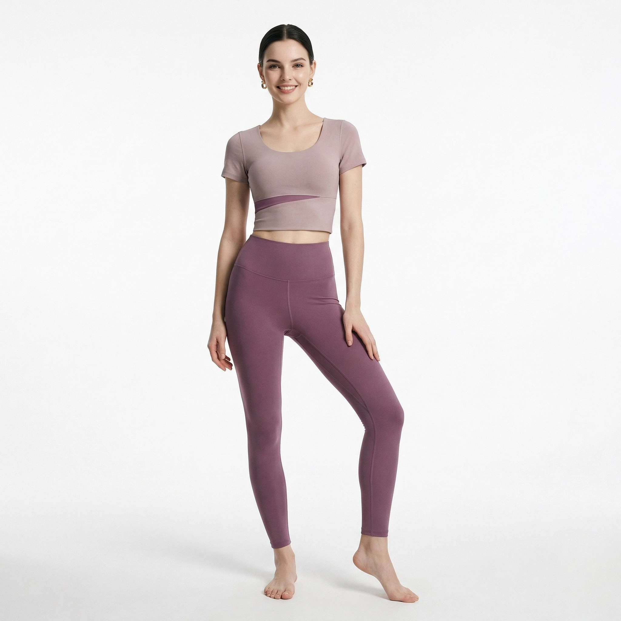 This yoga set features a gentle dusty pink & purple colorblock design, balancing aesthetics and functionality. The top is a short-sleeve U-neck crop top with an oblique colorblock stripe on the side, which flatters the waistline and adds a stylish touch. The bottom is a high-waist tight legging with a matching colorblock waistband, fitting closely to the waist and providing a strong butt-lifting effect. Made of highly elastic, skin-friendly, quick-dry sport fabric, it is breathable, sweat-wicking, and unrestrictive during stretching, offering a comfortable wearing experience for yoga, Pilates, or daily workouts.