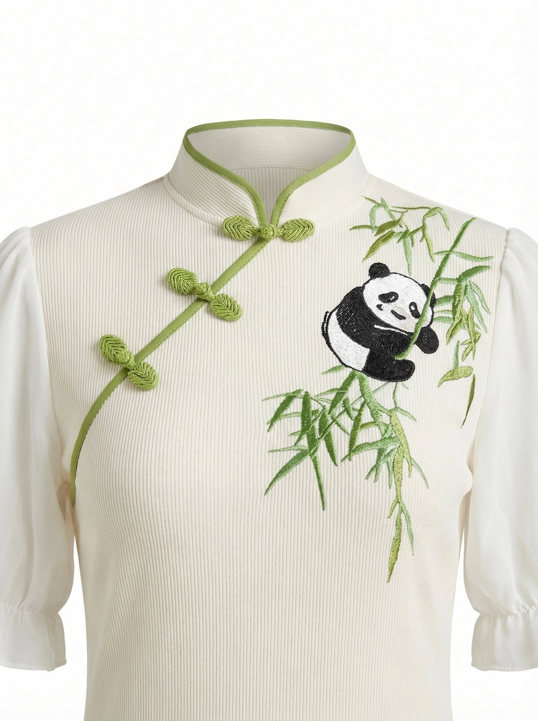 - Mandarin collar + green frog buttons + panda & bamboo embroidery, restoring oriental charm