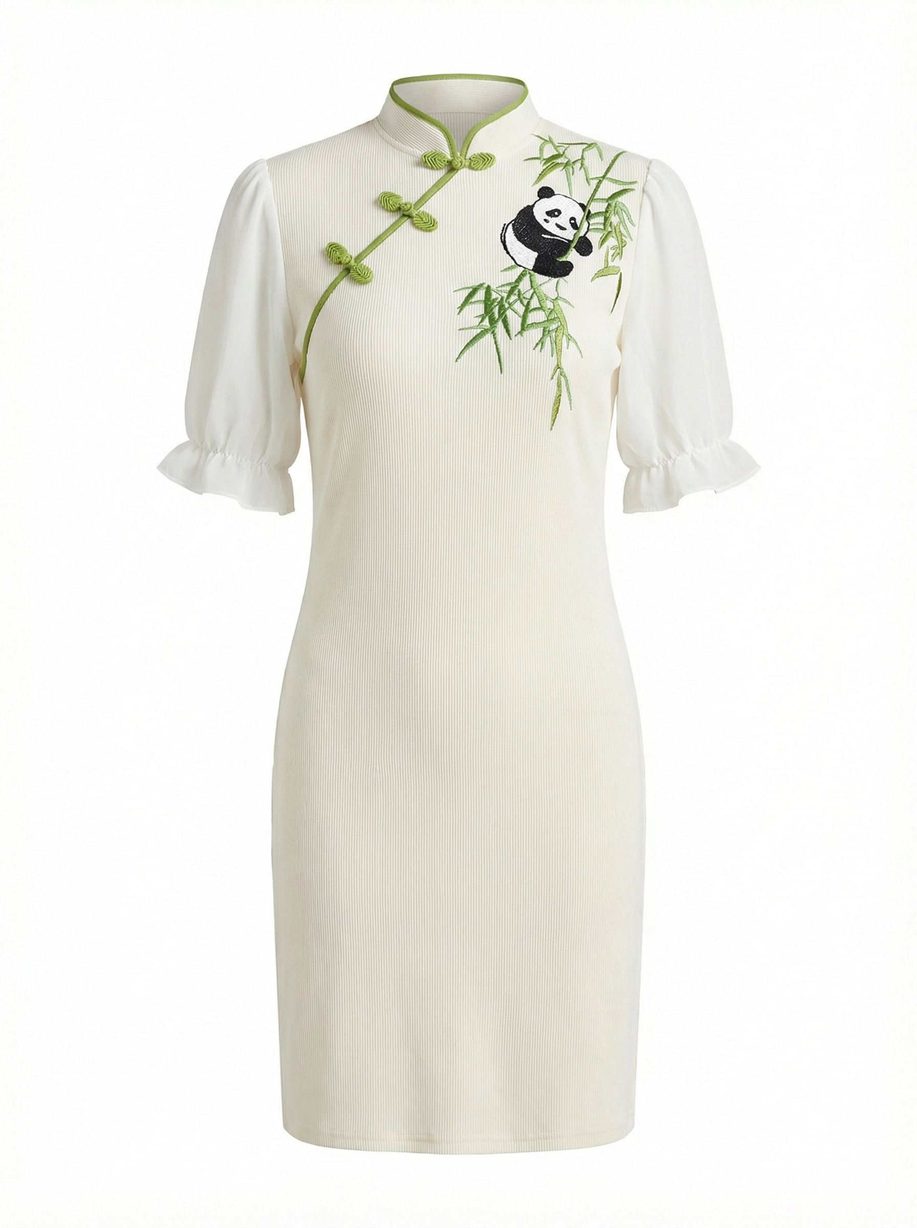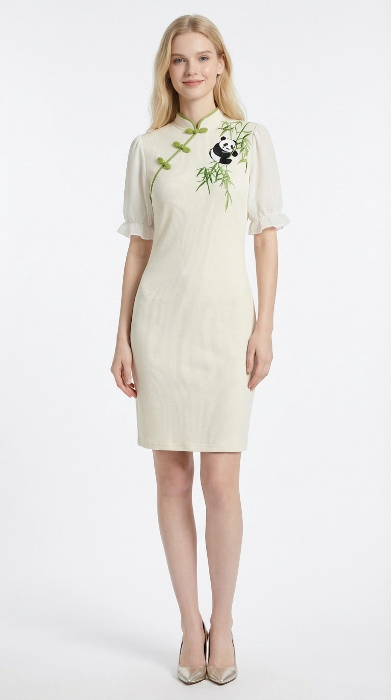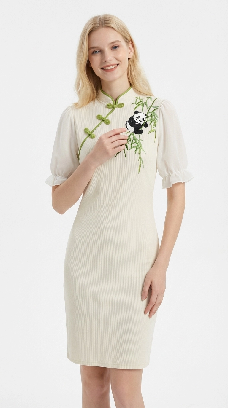 This improved new Chinese style Qipao dress is based on creamy white vertical ribbed knit, blending classic Qipao elements with modern design. The mandarin collar is paired with green frog buttons, and the chest is decorated with a panda hugging bamboo embroidery, which is vivid and cute with strong oriental charm. The puff sleeves and ruffled cuffs soften the crispness of the Qipao and add a girly touch. The slim bodycon silhouette outlines the curves, and the midi length is suitable for daily commuting and casual outings, making it a national style item that is both gentle and playful.