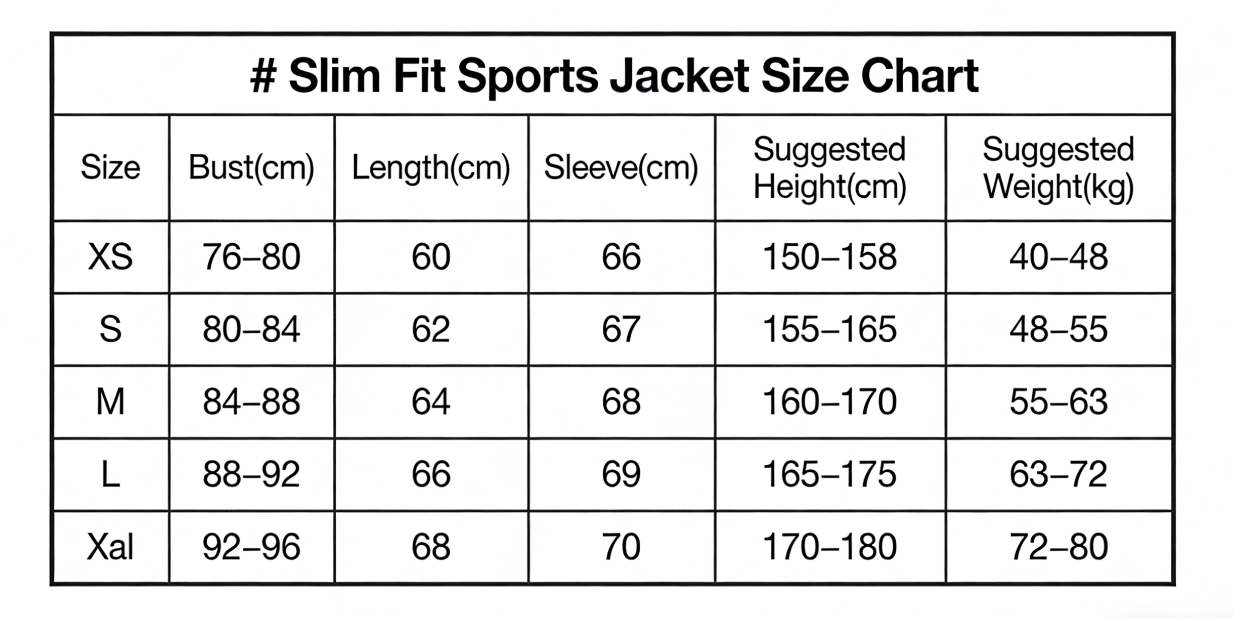 Olive Green Slim Fit Yoga Jacket (with Thumb Hole) - Size Chart