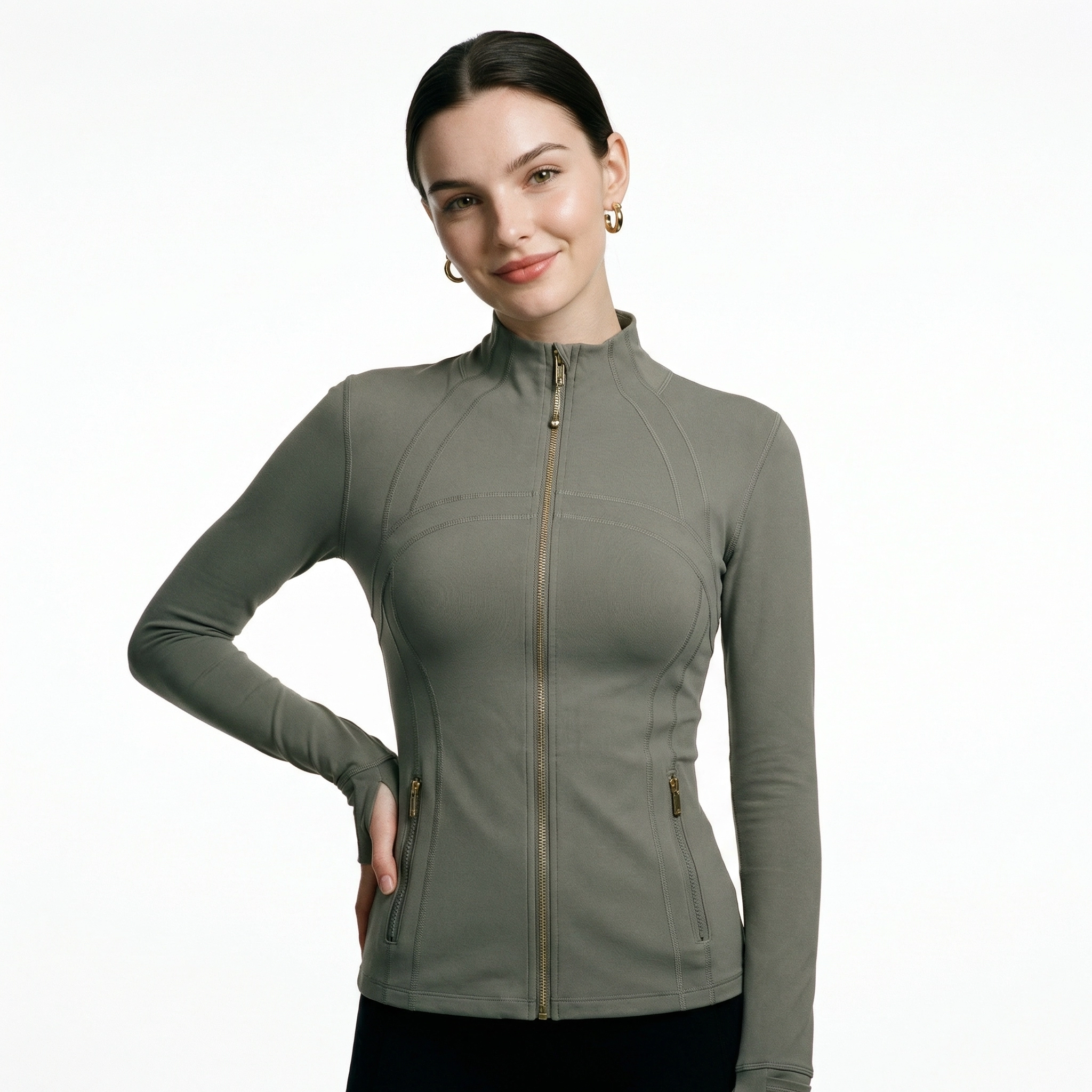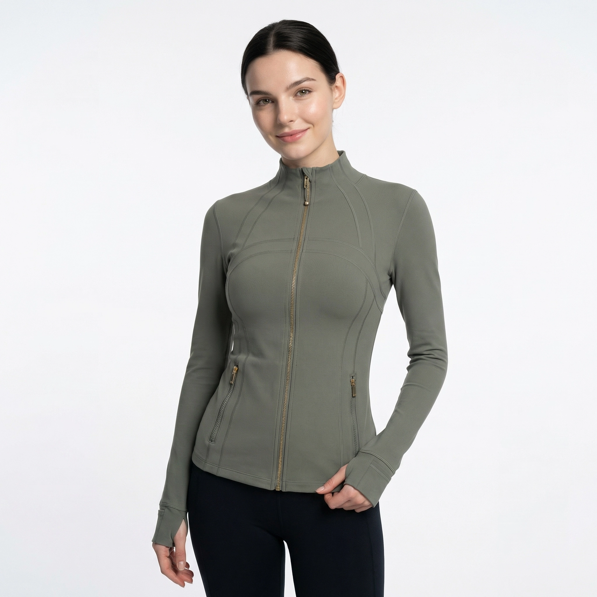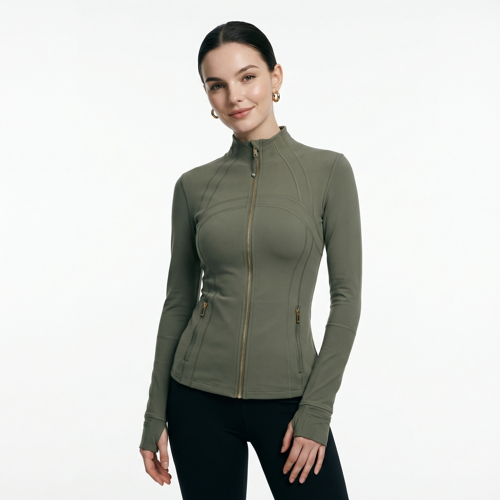 This olive green yoga jacket is made of high-elastic nylon-spandex blend fabric, featuring skin-friendly breathability, quick-drying and wrinkle-resistant properties to wick sweat instantly during sports. The classic stand-up collar modifies the shoulder and neckline, while the metal zipper ensures smooth opening and enhances the garment's texture. Side pockets offer storage for small essentials, and the thumb hole design balances warmth and mobility. The slim-fit cut precisely accentuates the body shape, making it ideal for yoga, fitness, running, and daily commuting with a sleek and comfortable look.