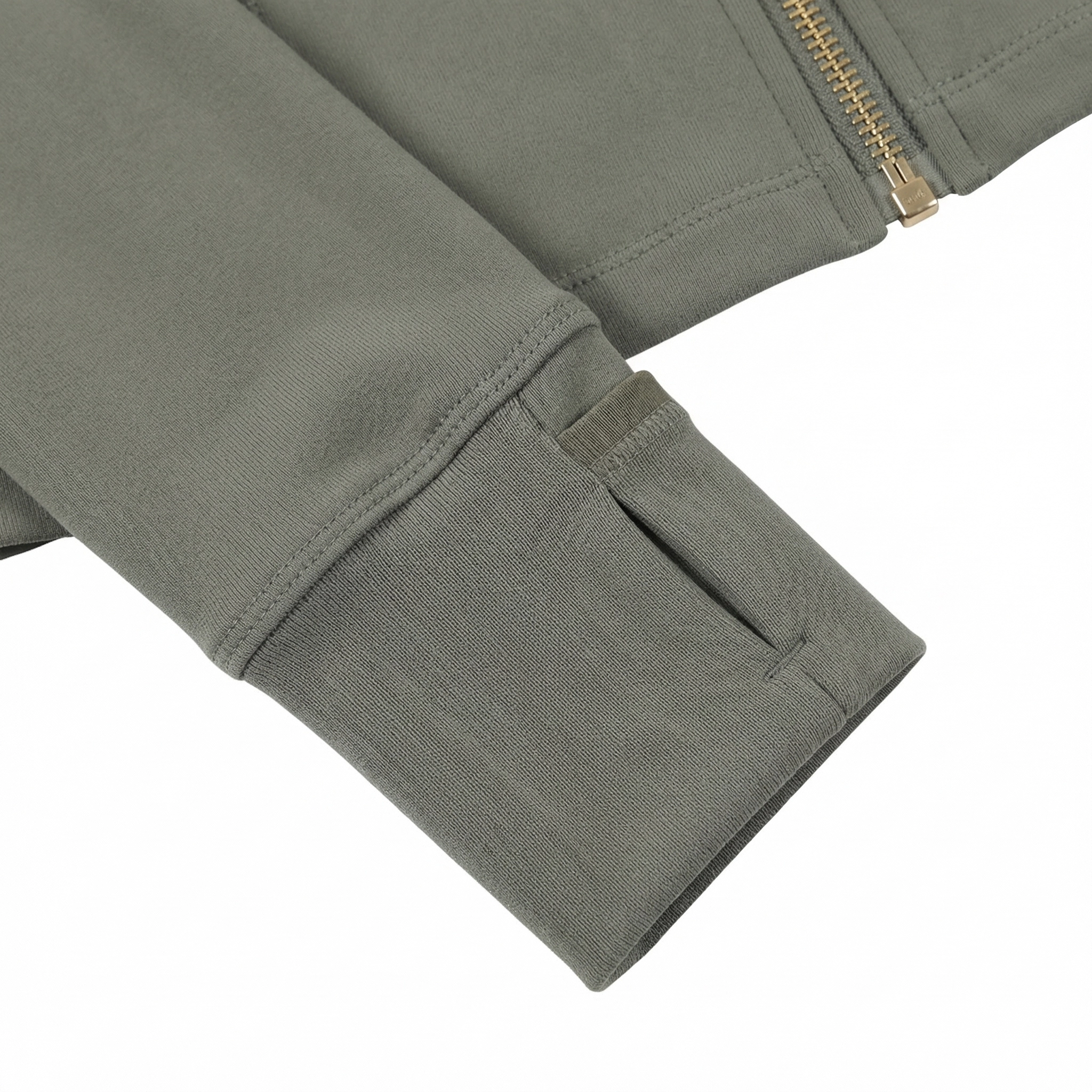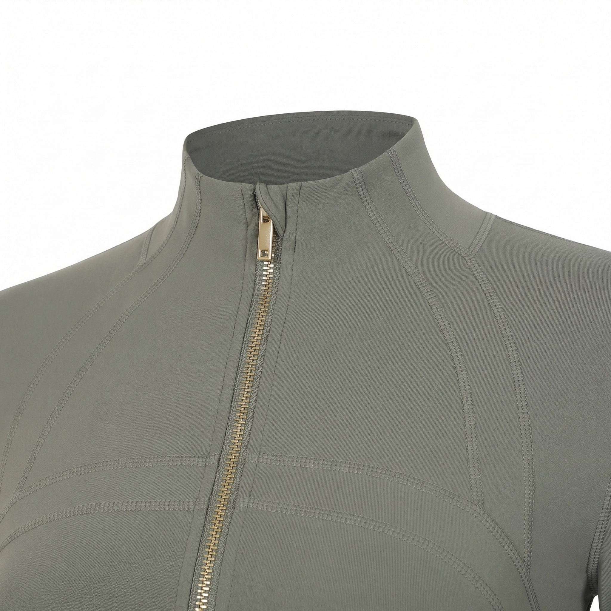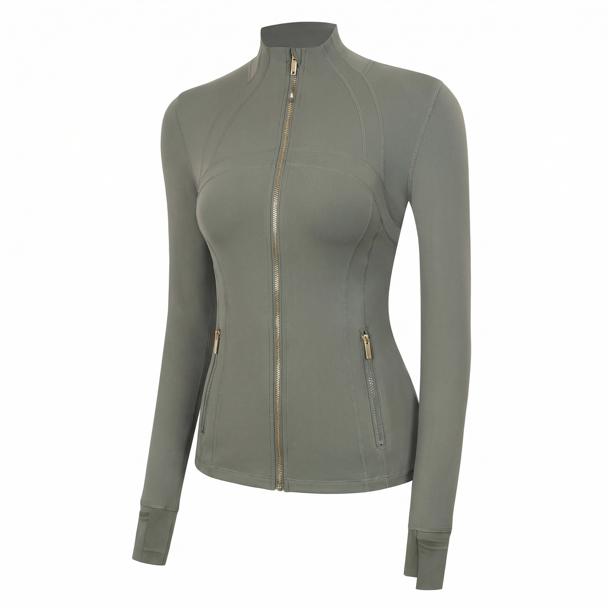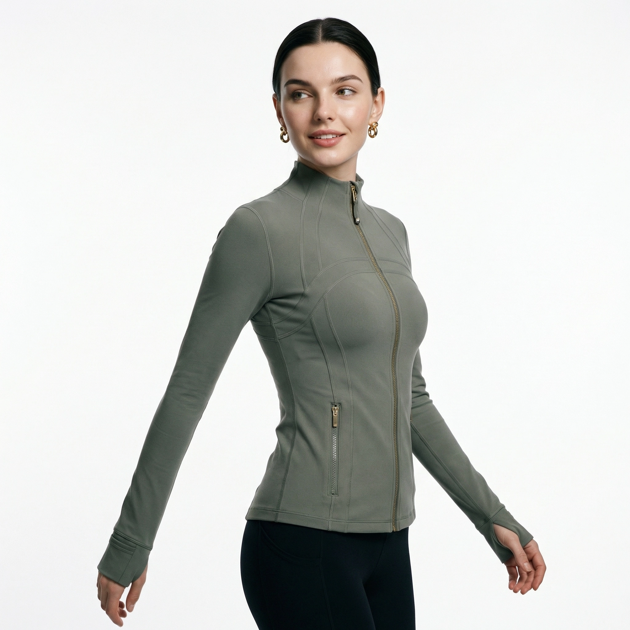 This olive green yoga jacket is made of high-elastic nylon-spandex blend fabric, featuring skin-friendly breathability, quick-drying and wrinkle-resistant properties to wick sweat instantly during sports. The classic stand-up collar modifies the shoulder and neckline, while the metal zipper ensures smooth opening and enhances the garment's texture. Side pockets offer storage for small essentials, and the thumb hole design balances warmth and mobility. The slim-fit cut precisely accentuates the body shape, making it ideal for yoga, fitness, running, and daily commuting with a sleek and comfortable look.
