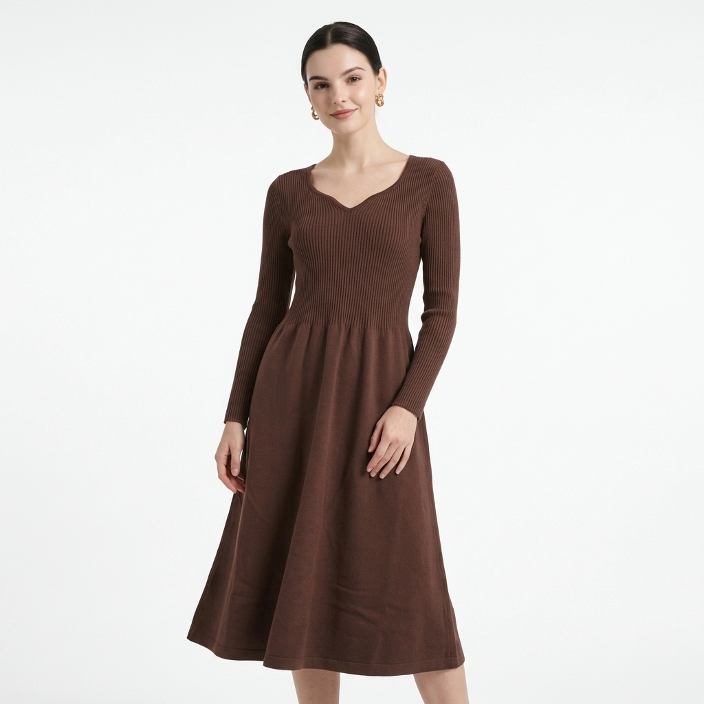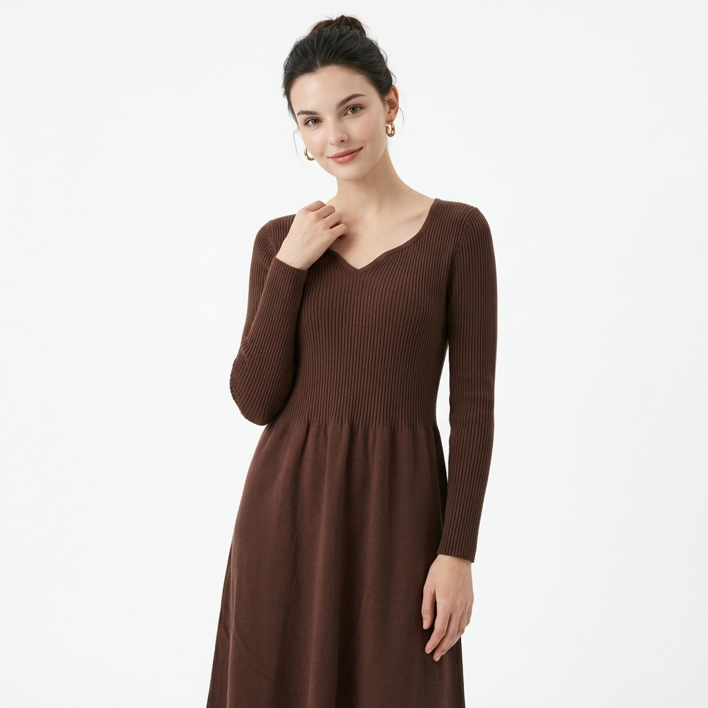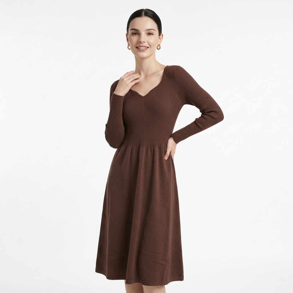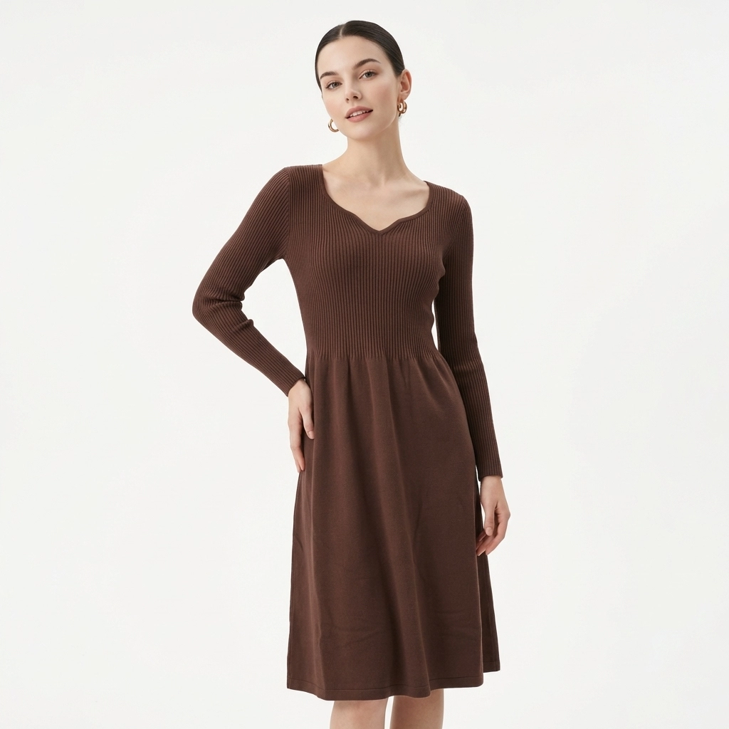 This dark brown knitted dress features a gentle retro autumn/winter vibe. The unique Heart-Shaped Neckline flatters the shoulder and neck line, exuding a sweet and romantic aura. The upper body is made of high-stretch vertical ribbed knit that fits closely to the body, easily outlining the curves. The high waist design paired with an A-line flared skirt perfectly hides imperfections and optimizes the body shape. The soft and skin-friendly knit fabric balances warmth and comfort. With a midi length hitting below the knee, it is suitable for daily commuting, dates, and outings, making it a versatile and elegant staple in the winter wardrobe.