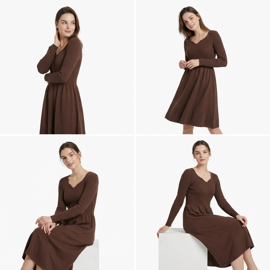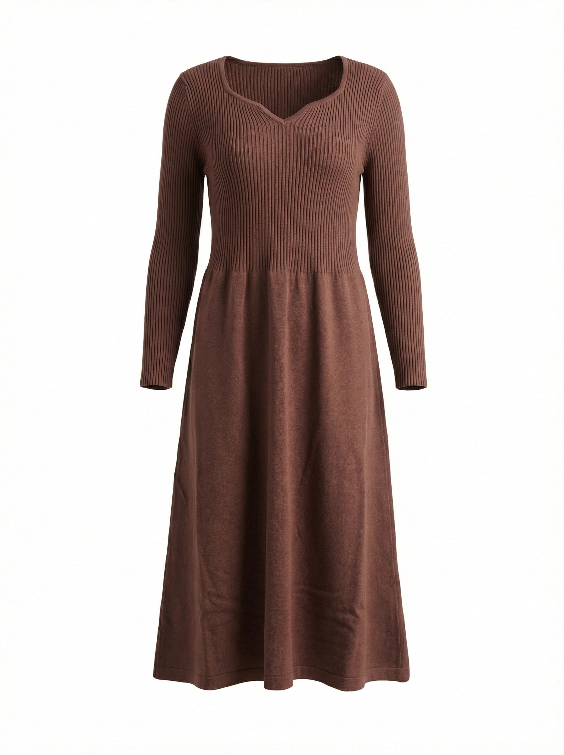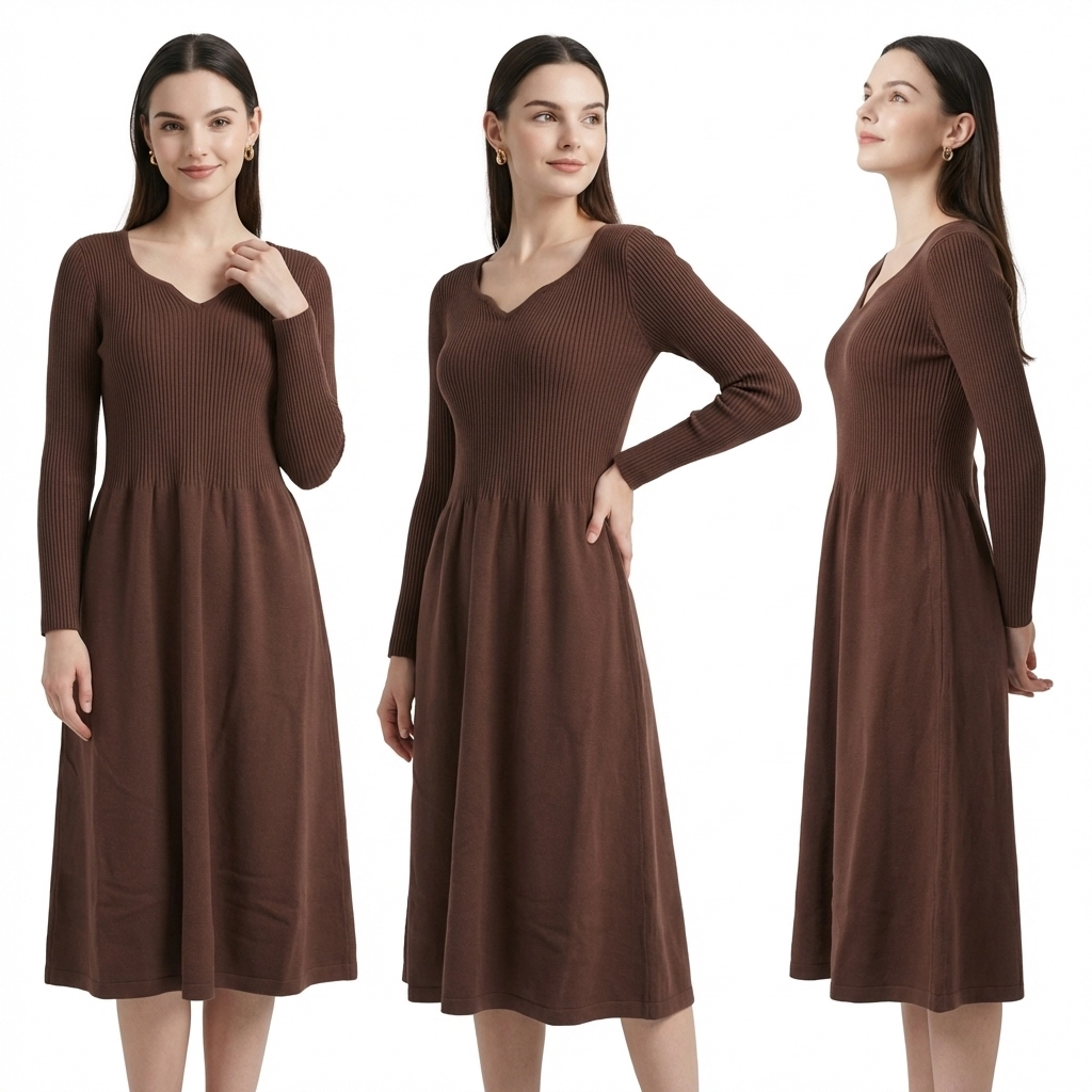 This dark brown knitted dress features a gentle retro autumn/winter vibe. The unique Heart-Shaped Neckline flatters the shoulder and neck line, exuding a sweet and romantic aura. The upper body is made of high-stretch vertical ribbed knit that fits closely to the body, easily outlining the curves. The high waist design paired with an A-line flared skirt perfectly hides imperfections and optimizes the body shape. The soft and skin-friendly knit fabric balances warmth and comfort. With a midi length hitting below the knee, it is suitable for daily commuting, dates, and outings, making it a versatile and elegant staple in the winter wardrobe.