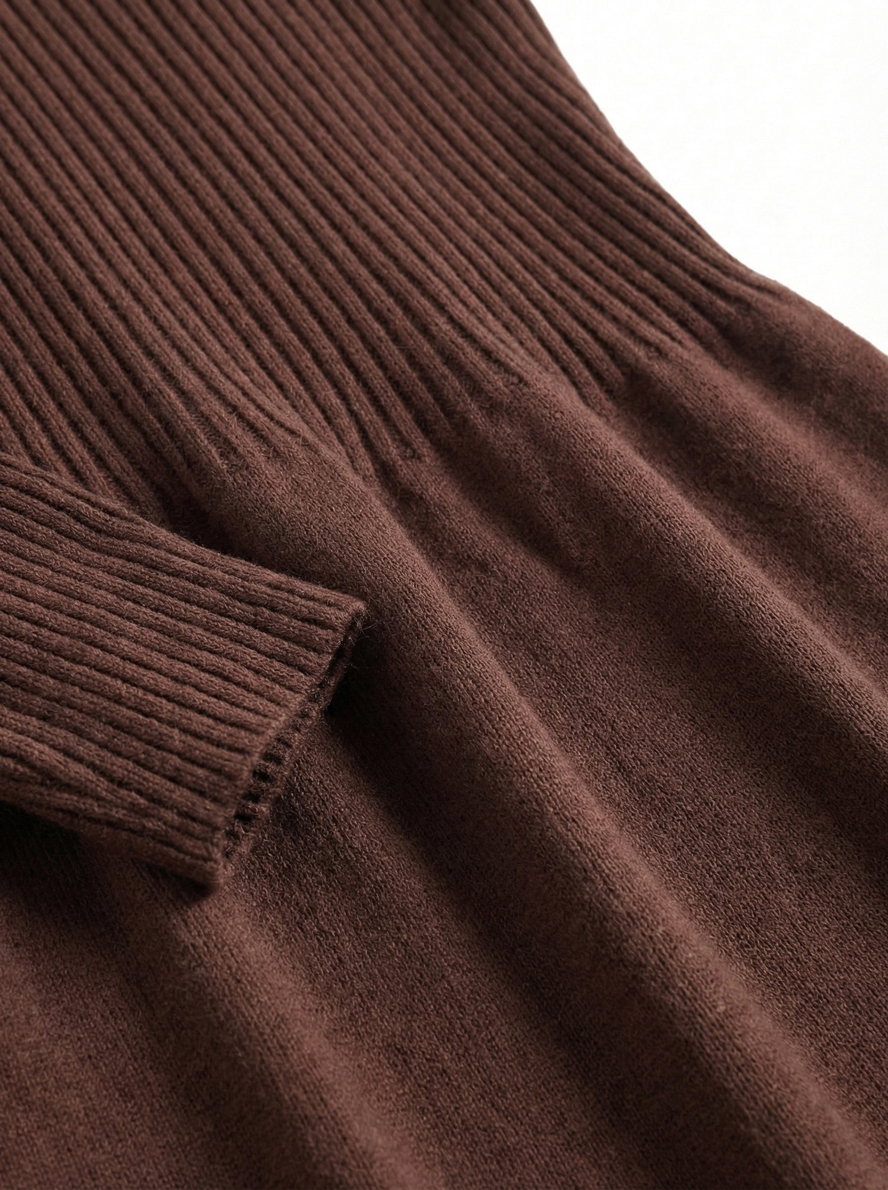 - Lower Part (Skirt Area): Fine plain knit fabric (same material blend as the upper part), with good drape, soft touch, light and comfortable to wear. It creates a material contrast with the ribbed area to enrich layering.