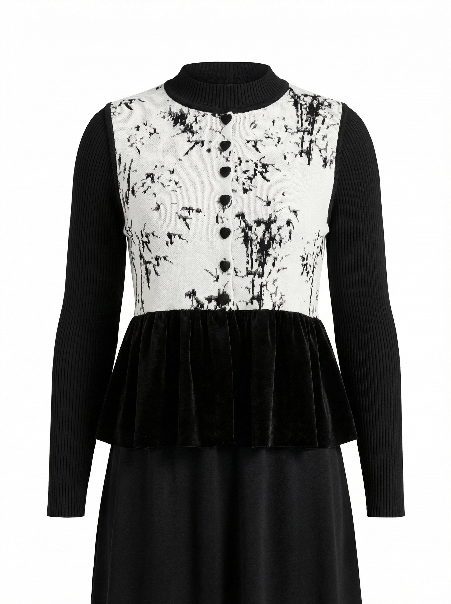 This knit two-piece set includes a black inner dress and a fake two-piece spliced knit top. The overall style is gentle and elegant with rich layers. The knit top features exquisite splicing design, simple and detailed; the inner dress is slim fit, draping and comfortable. The complete set is easy to wear and high-end, suitable for daily commute, dating, casual outings, easily creating an elegant look.