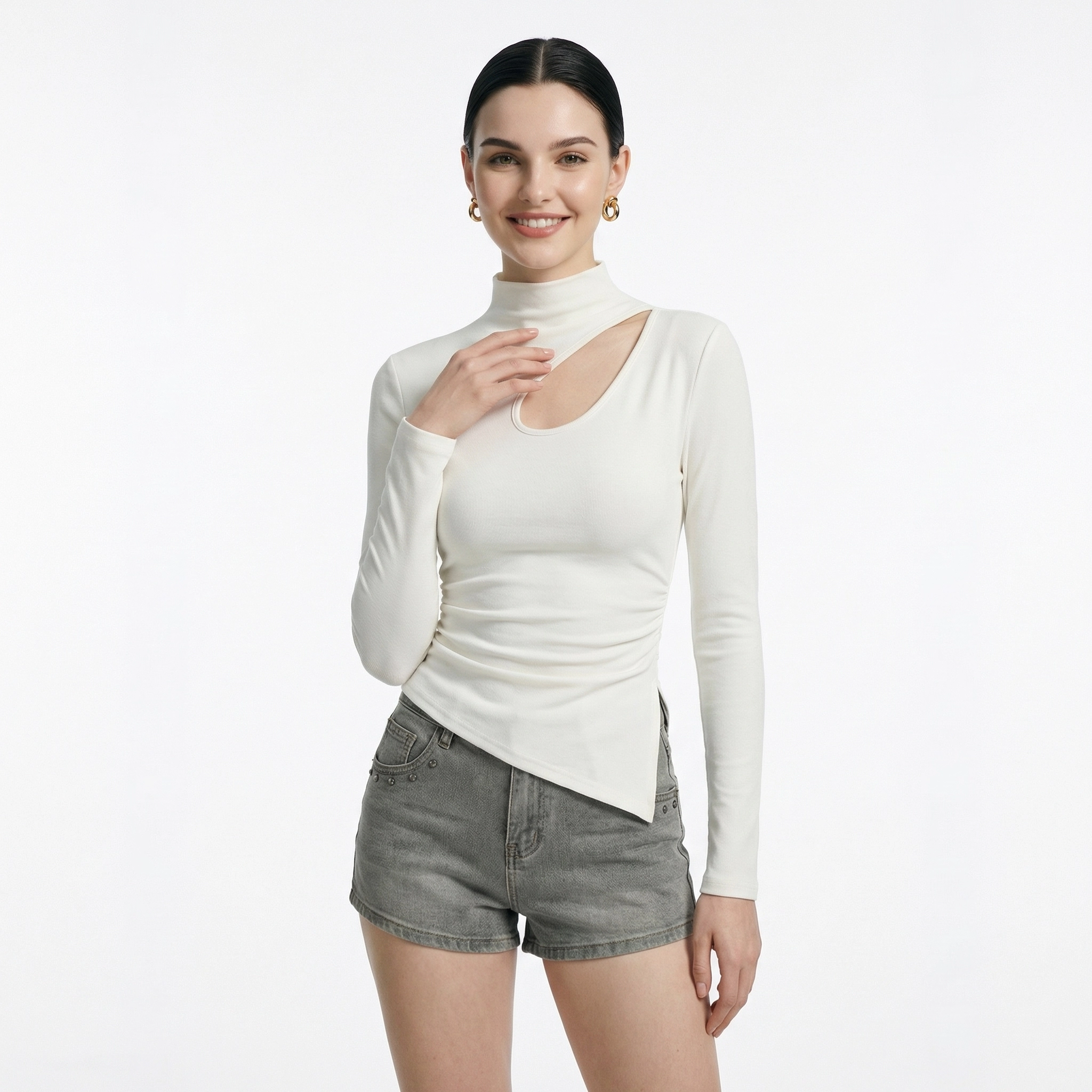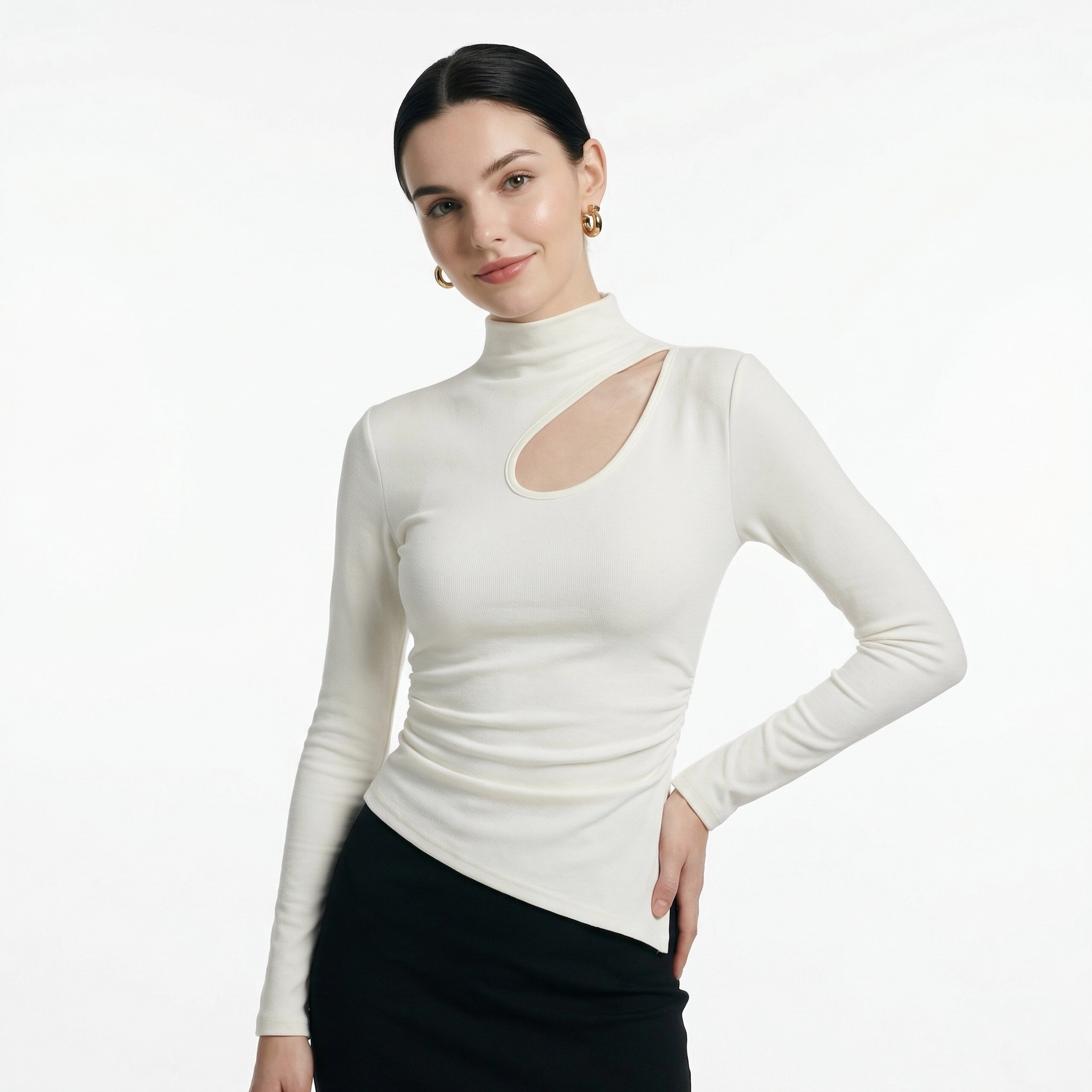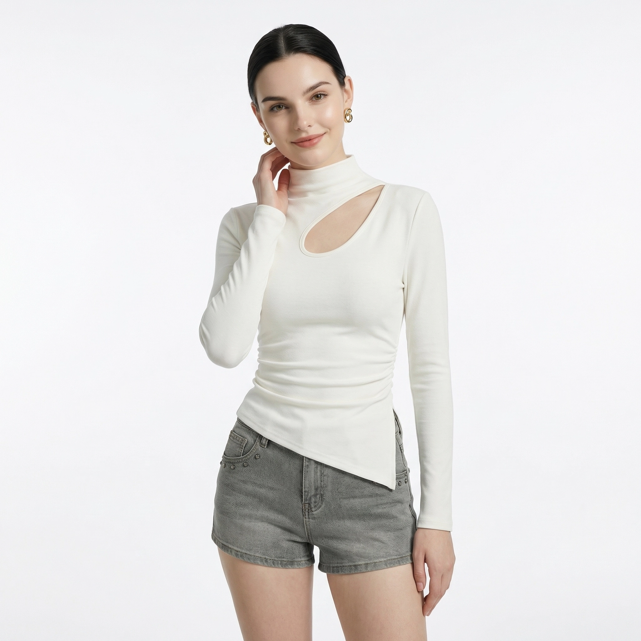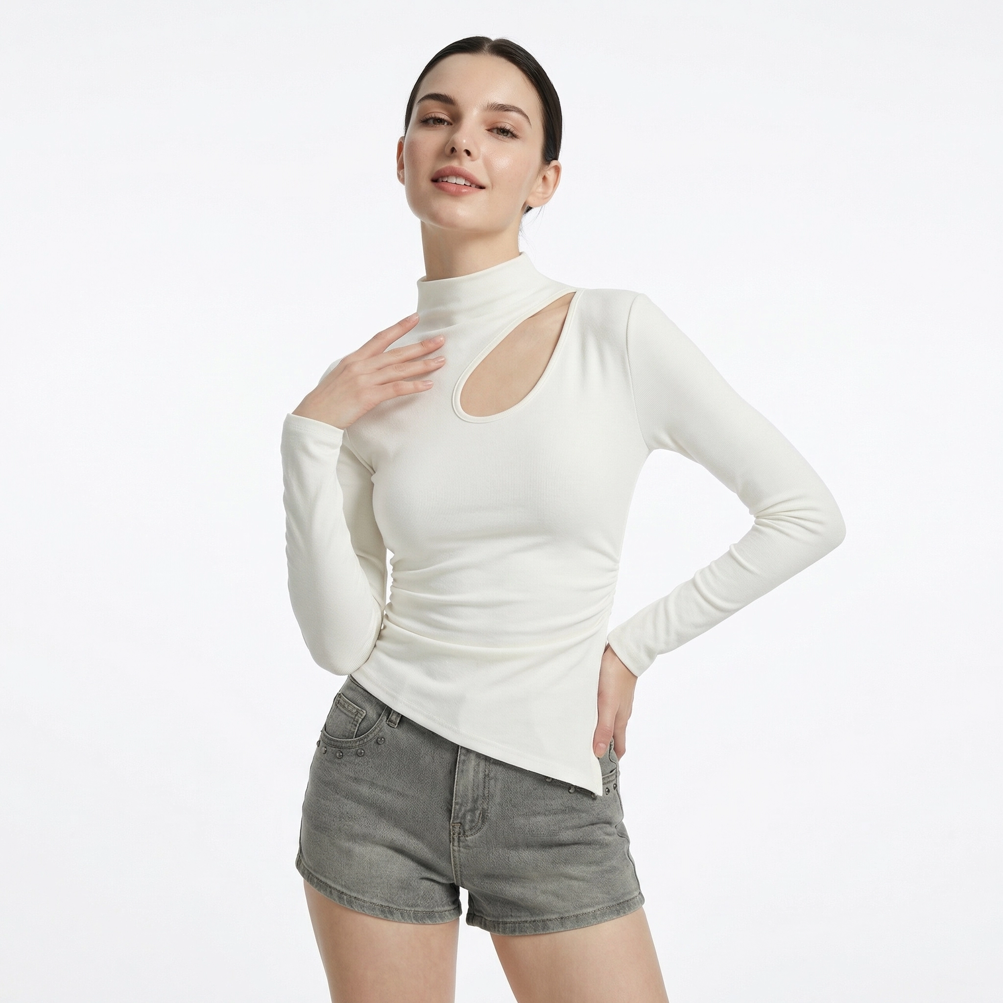 This white knit top features a mock neck with a one-side cutout design, cleverly exposing the collarbone to add a touch of sexiness to elegance. The side ruched craft naturally cinches the waist, paired with an asymmetric hem cut, visually lengthening the leg line to easily create a 3:7 figure. Made of high-stretch ribbed knit fabric, it is soft, skin-friendly, breathable and not stuffy, with good stretch and resilience, not easy to deform after long wear. Whether worn alone for a sexy vibe, or layered as a base under blazers or slip dresses, it adapts to various scenarios such as daily commuting, dating and going out, making it a versatile and eye-catching basic item in the wardrobe.