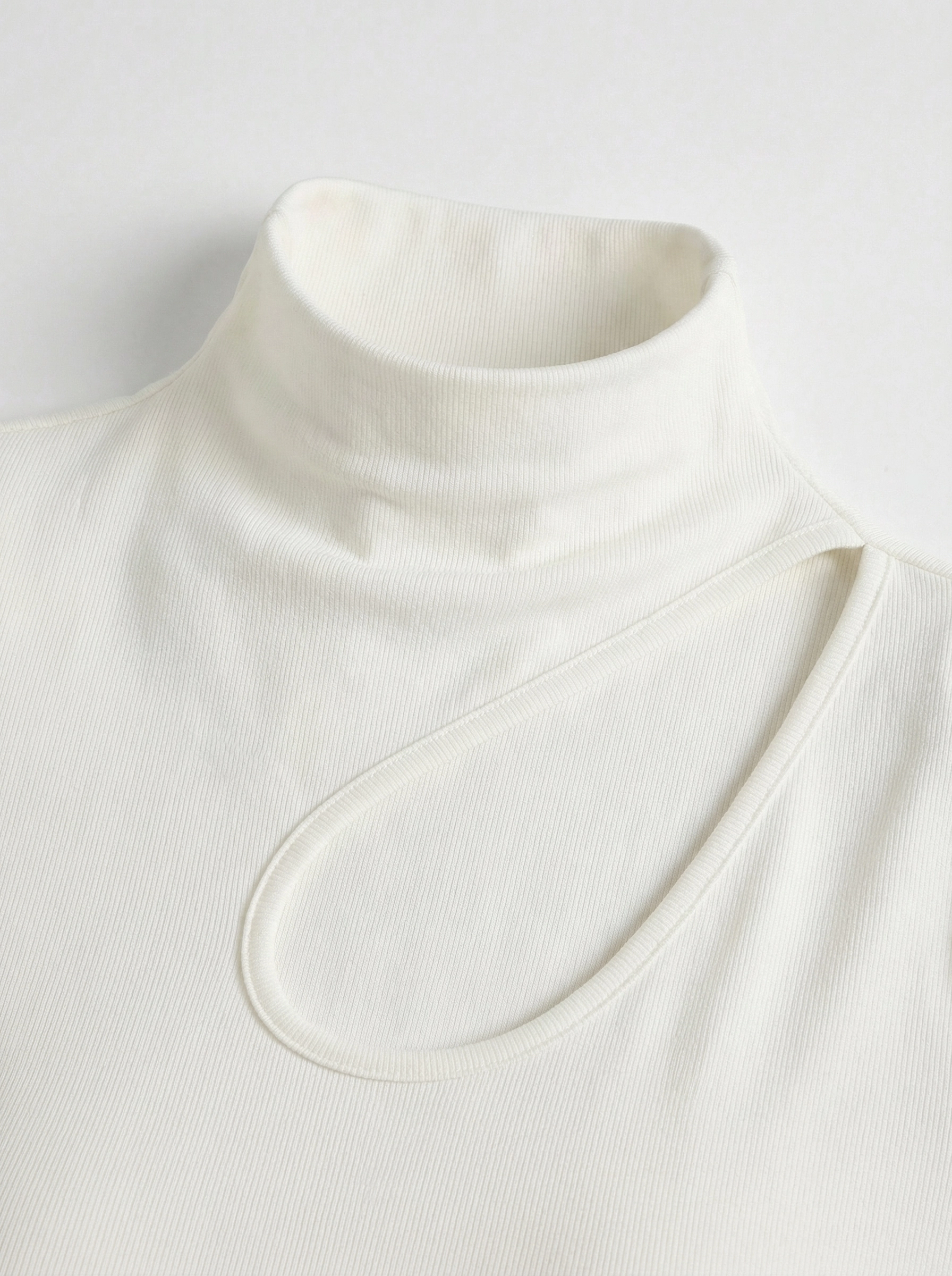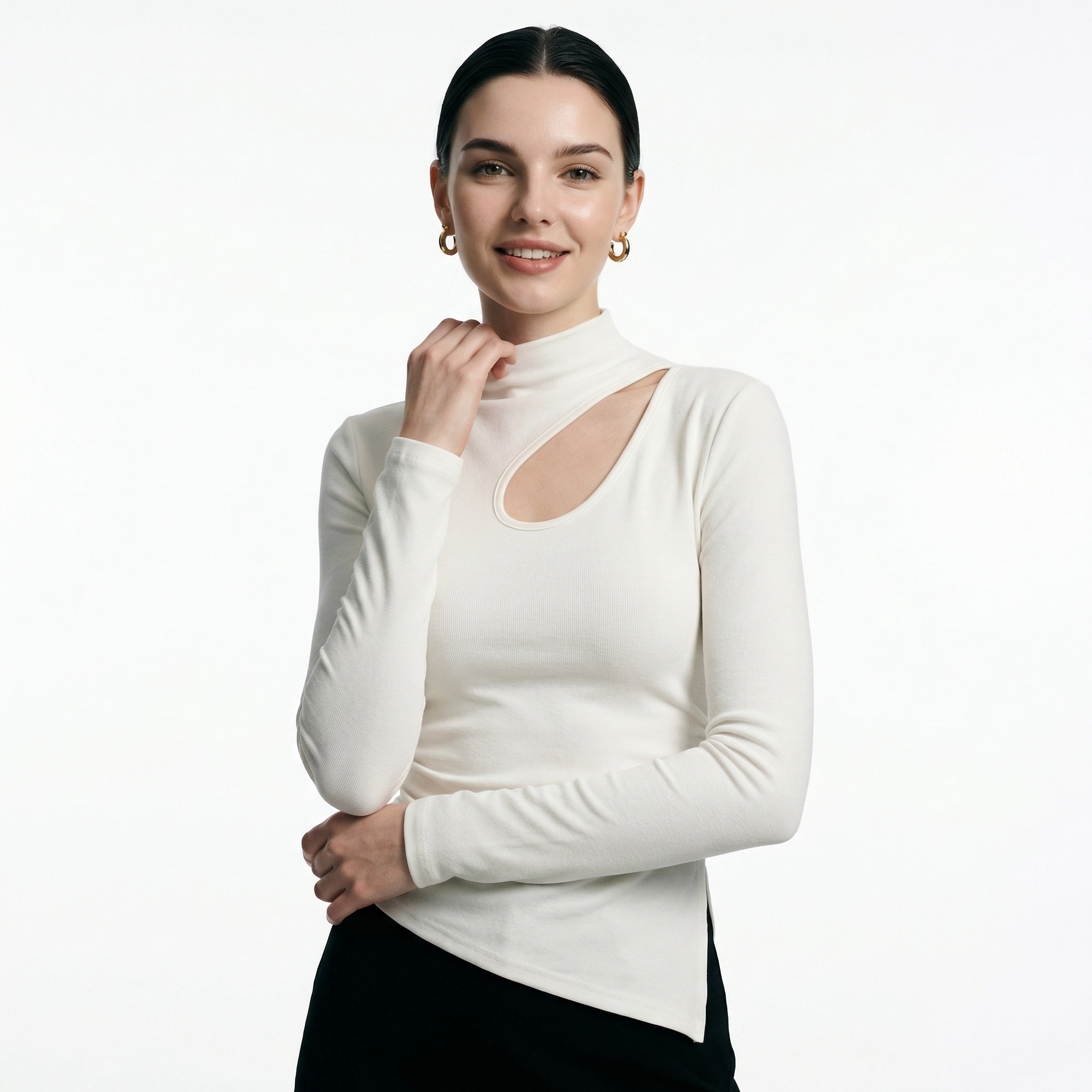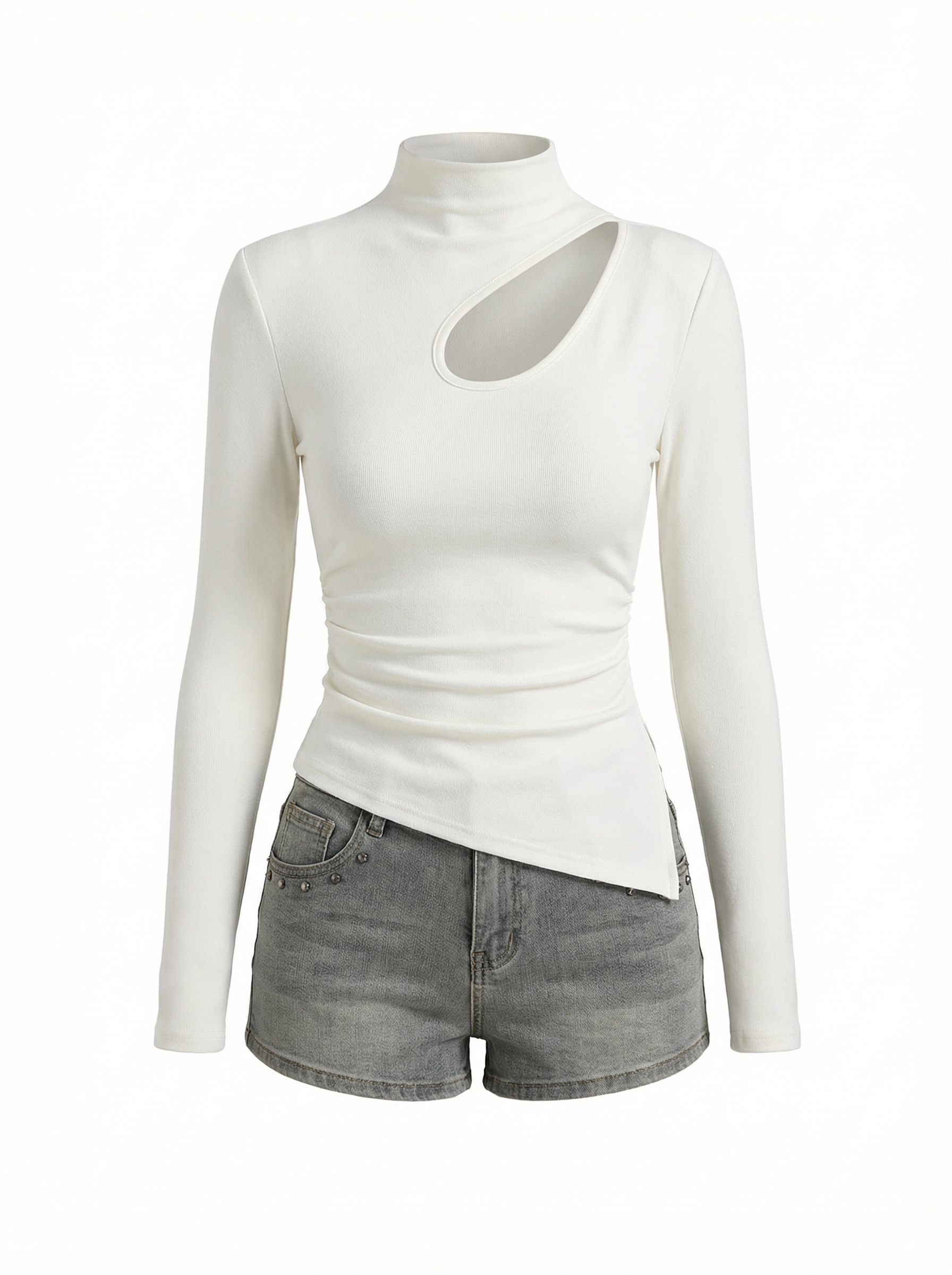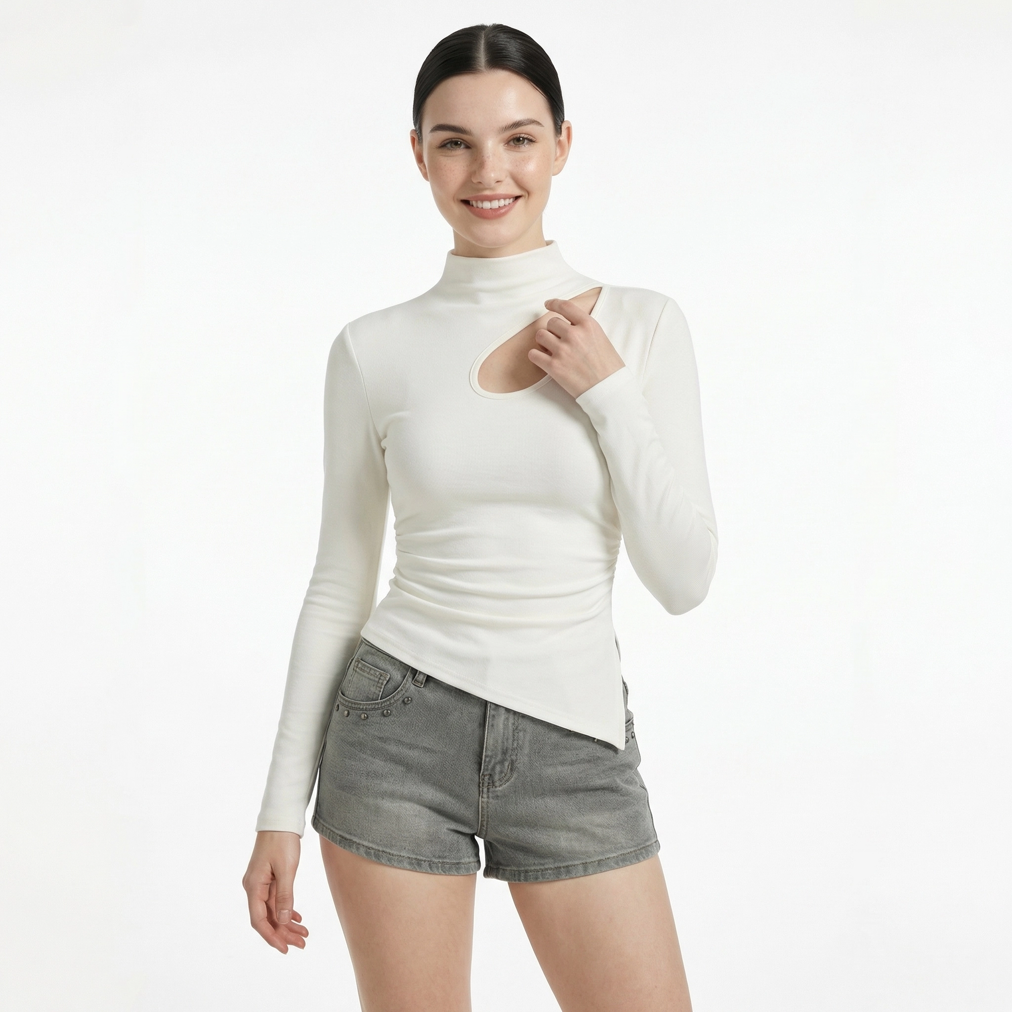 This white knit top features a mock neck with a one-side cutout design, cleverly exposing the collarbone to add a touch of sexiness to elegance. The side ruched craft naturally cinches the waist, paired with an asymmetric hem cut, visually lengthening the leg line to easily create a 3:7 figure. Made of high-stretch ribbed knit fabric, it is soft, skin-friendly, breathable and not stuffy, with good stretch and resilience, not easy to deform after long wear. Whether worn alone for a sexy vibe, or layered as a base under blazers or slip dresses, it adapts to various scenarios such as daily commuting, dating and going out, making it a versatile and eye-catching basic item in the wardrobe.