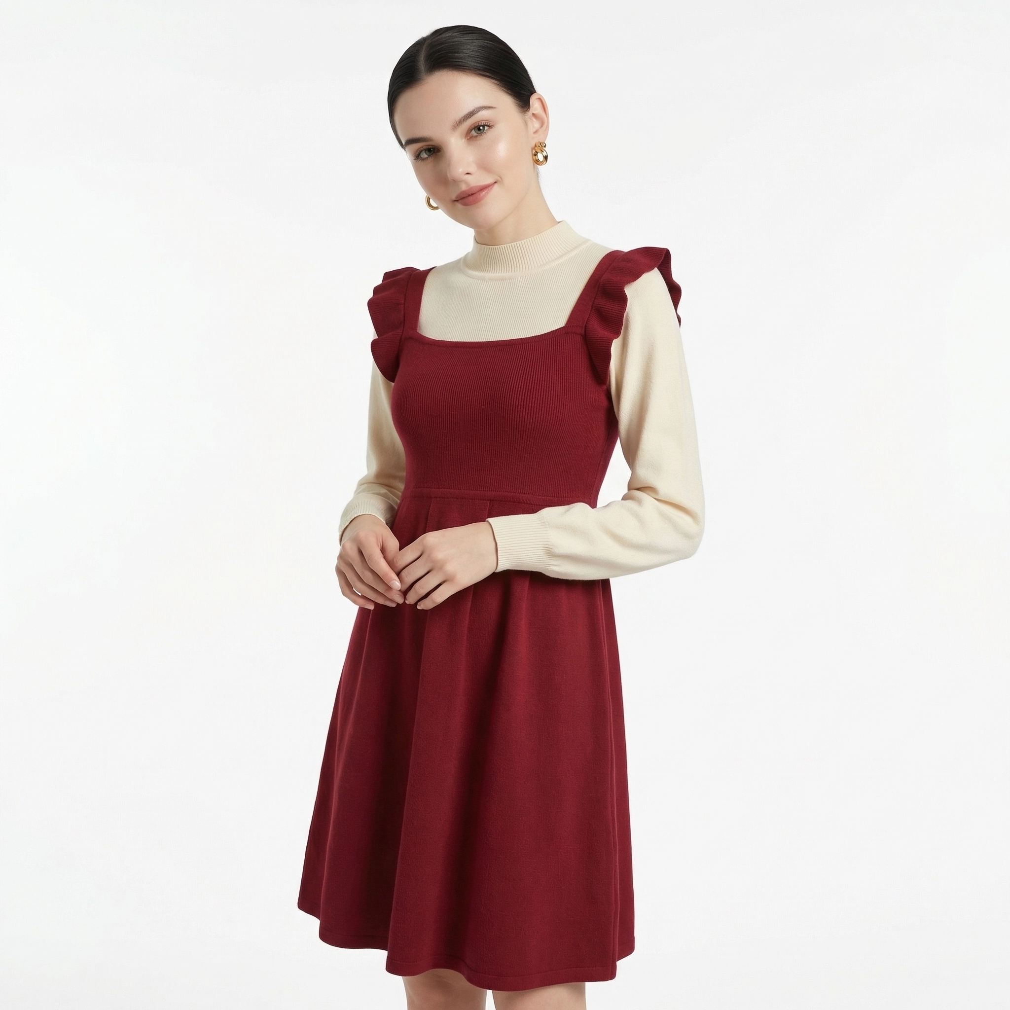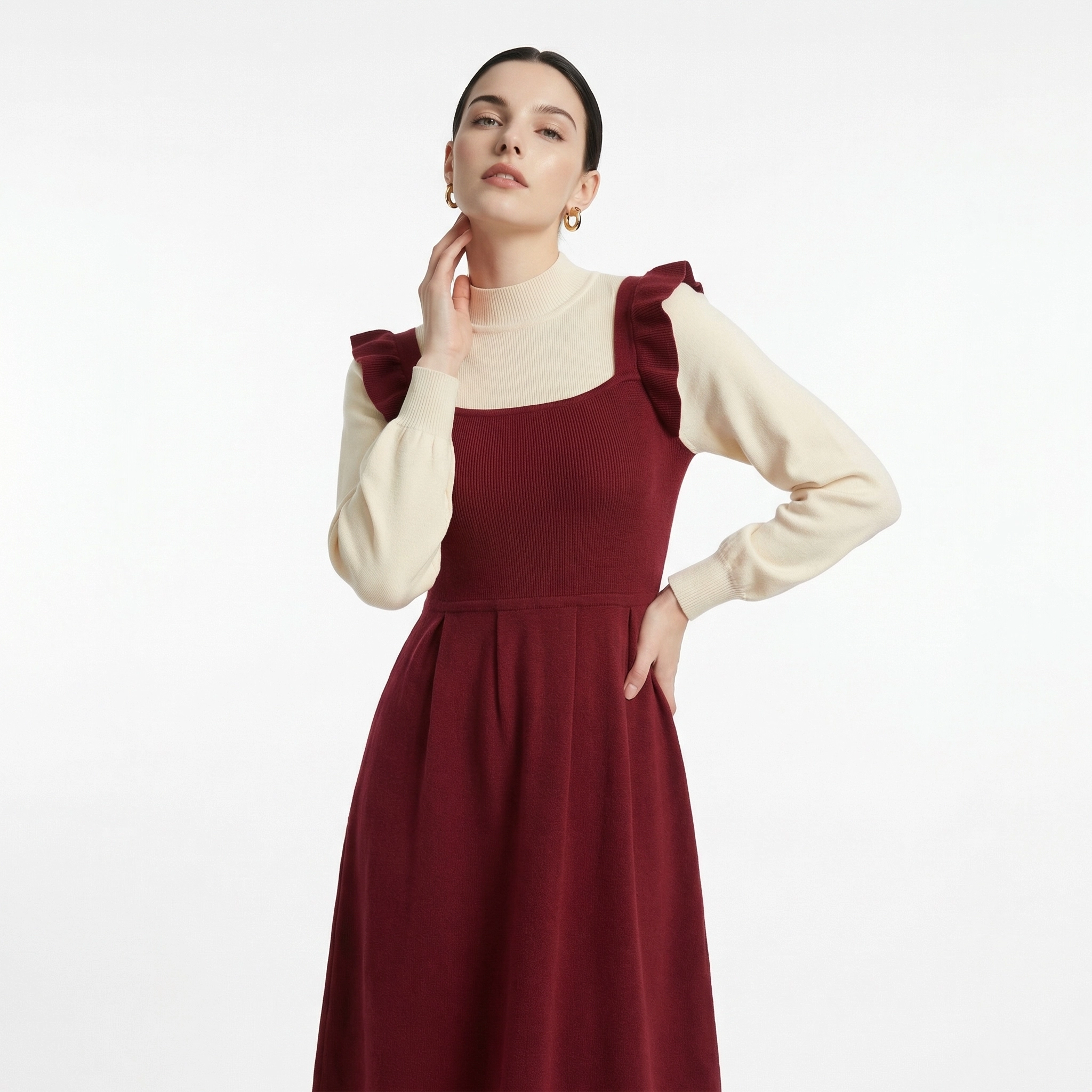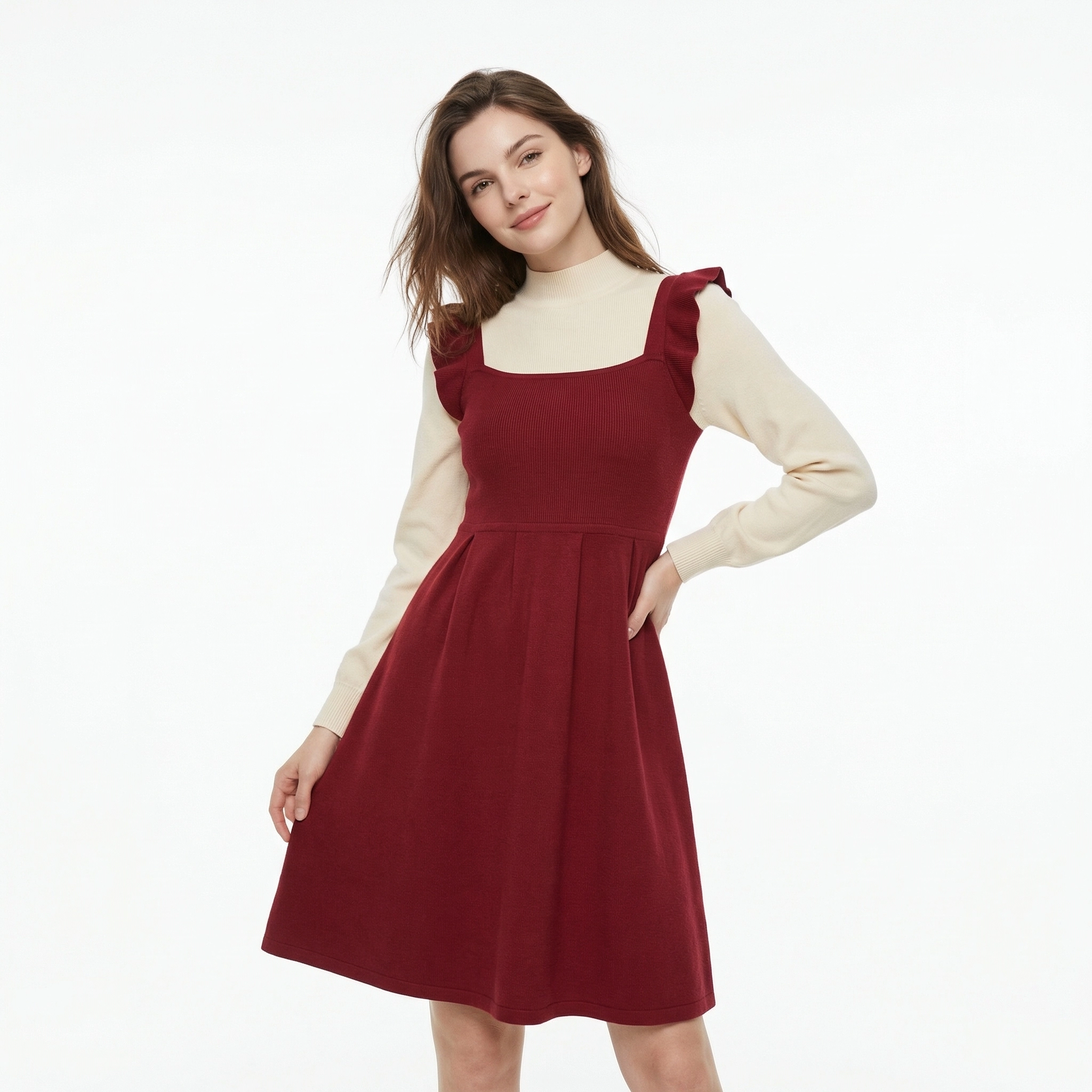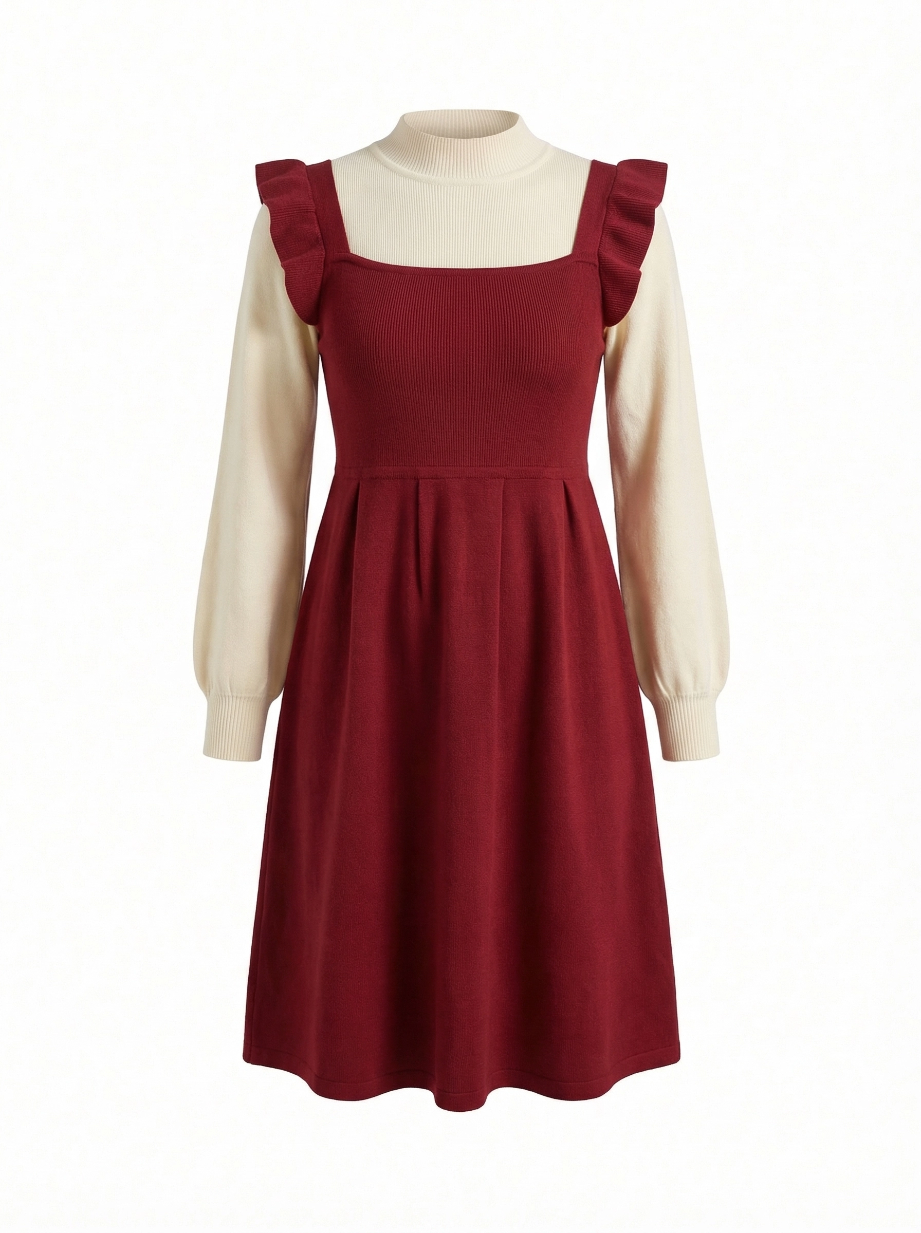 This two-tone knit dress features a classic color block of Ankora Red and off-white, creating a hassle-free no-layering look. The upper part has a square-neck cami design with delicate ruffled trim on the shoulder straps, adding a sweet and girly touch. The A-line flared skirt below flatters the legs and conceals flaws. The high-stretch vertical ribbed knit fabric is soft, warm, and comfortable. Whether for holiday gatherings or daily commutes, it is the showstopper that elevates your outfit game.