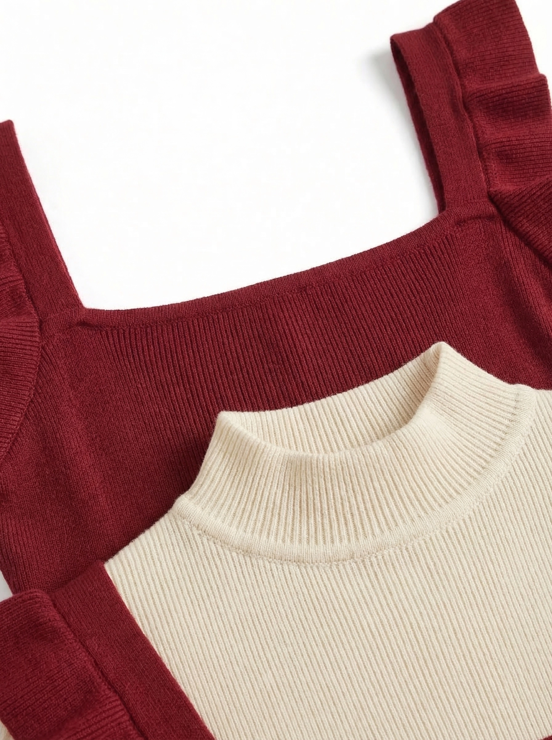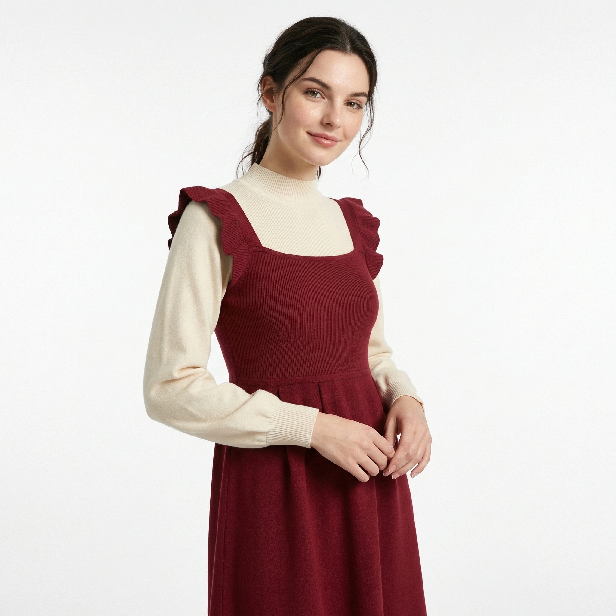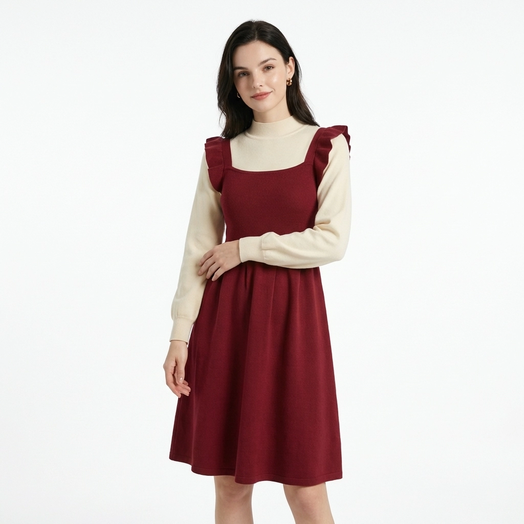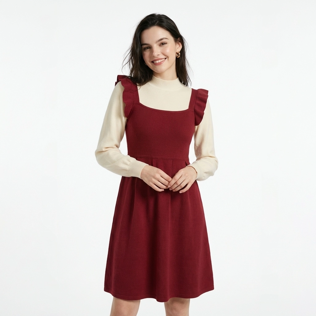 This two-tone knit dress features a classic color block of Ankora Red and off-white, creating a hassle-free no-layering look. The upper part has a square-neck cami design with delicate ruffled trim on the shoulder straps, adding a sweet and girly touch. The A-line flared skirt below flatters the legs and conceals flaws. The high-stretch vertical ribbed knit fabric is soft, warm, and comfortable. Whether for holiday gatherings or daily commutes, it is the showstopper that elevates your outfit game.
