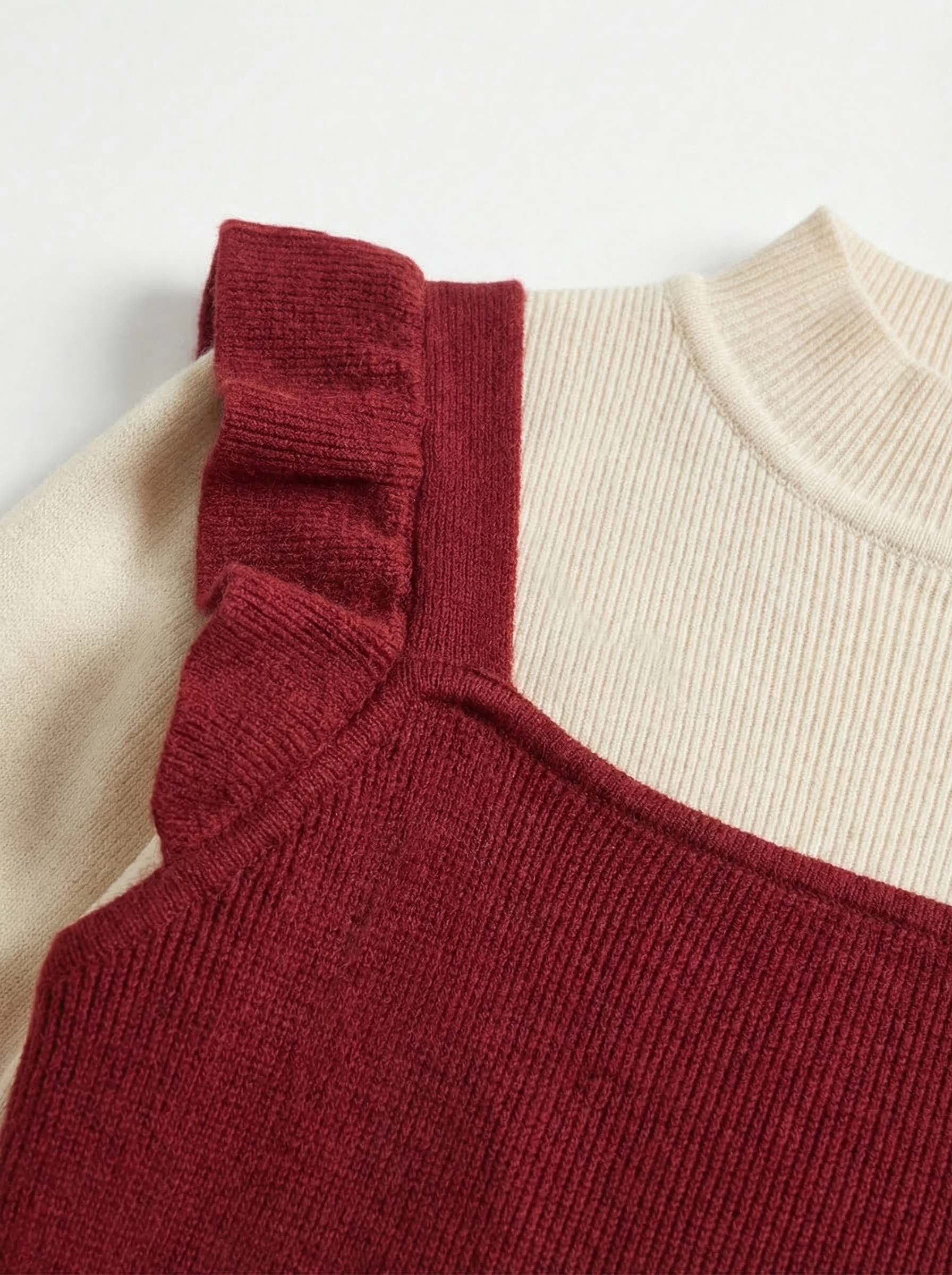 Two-Tone Ruffled Two-Piece Knit Dress, Ankora Red Slim-Fit A-Line Midi Dress