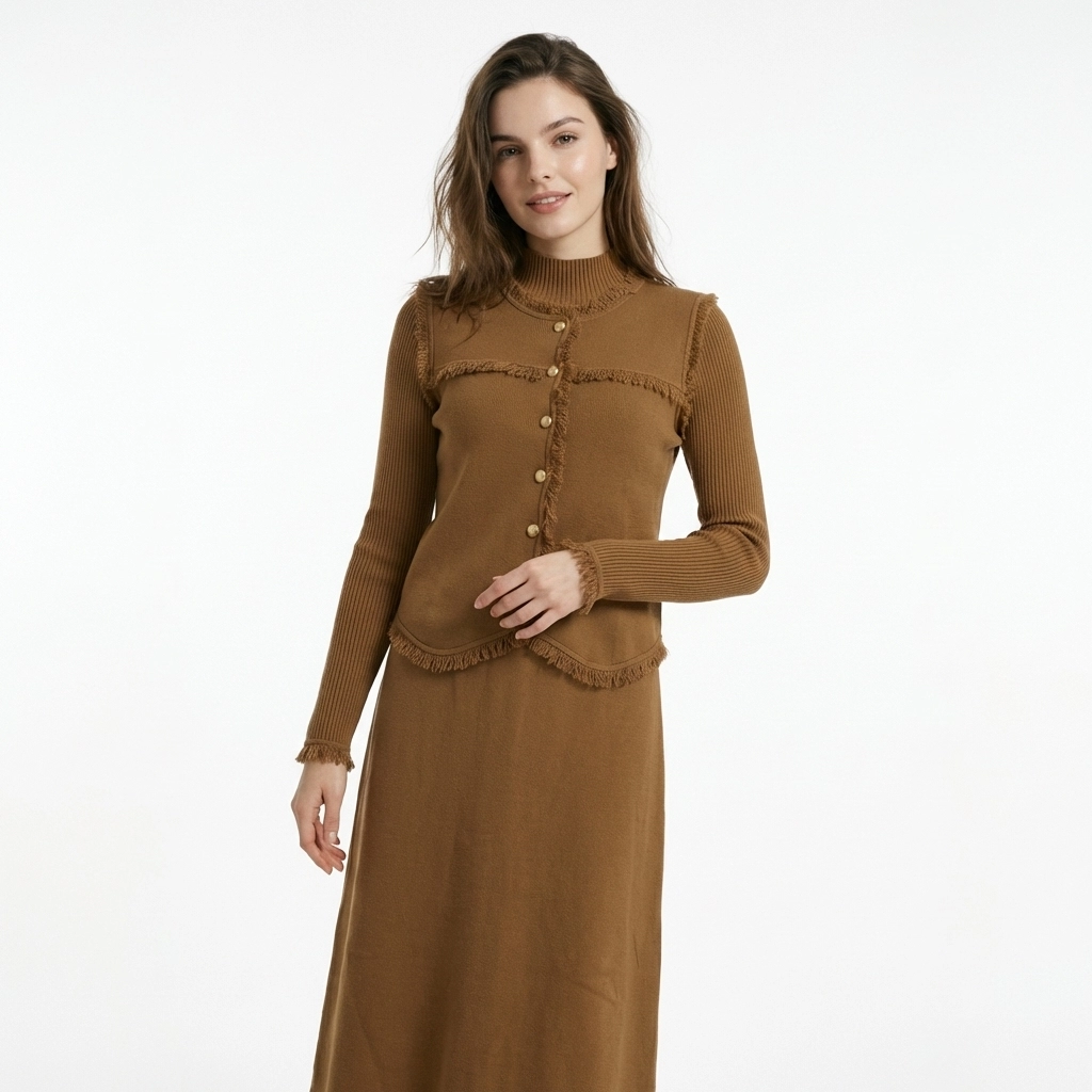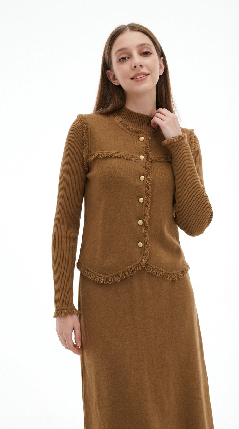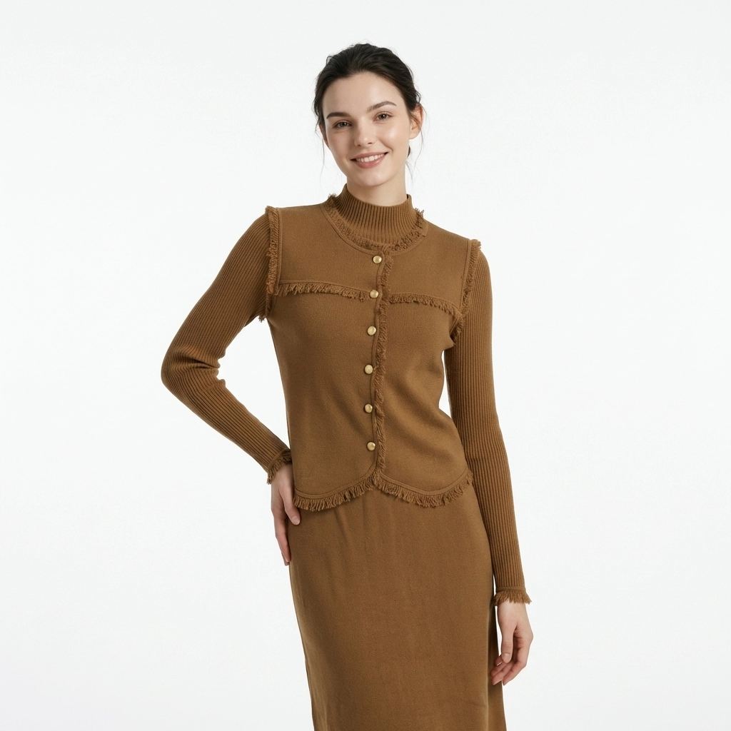 This caramel knit two-piece set centers on vintage fringed details, including a mock-neck long-sleeve inner, a vest, and a midi skirt (or dress). Made of soft knit fabric, it is warm and skin-friendly. The fringed trims on the vest edges, cuffs, and hem, paired with golden metal buttons, retain the gentle texture of knitwear while adding a touch of retro delicacy. It is an elegant choice for commuting and dating in spring and autumn, and can also be mixed and matched to create diverse styles.