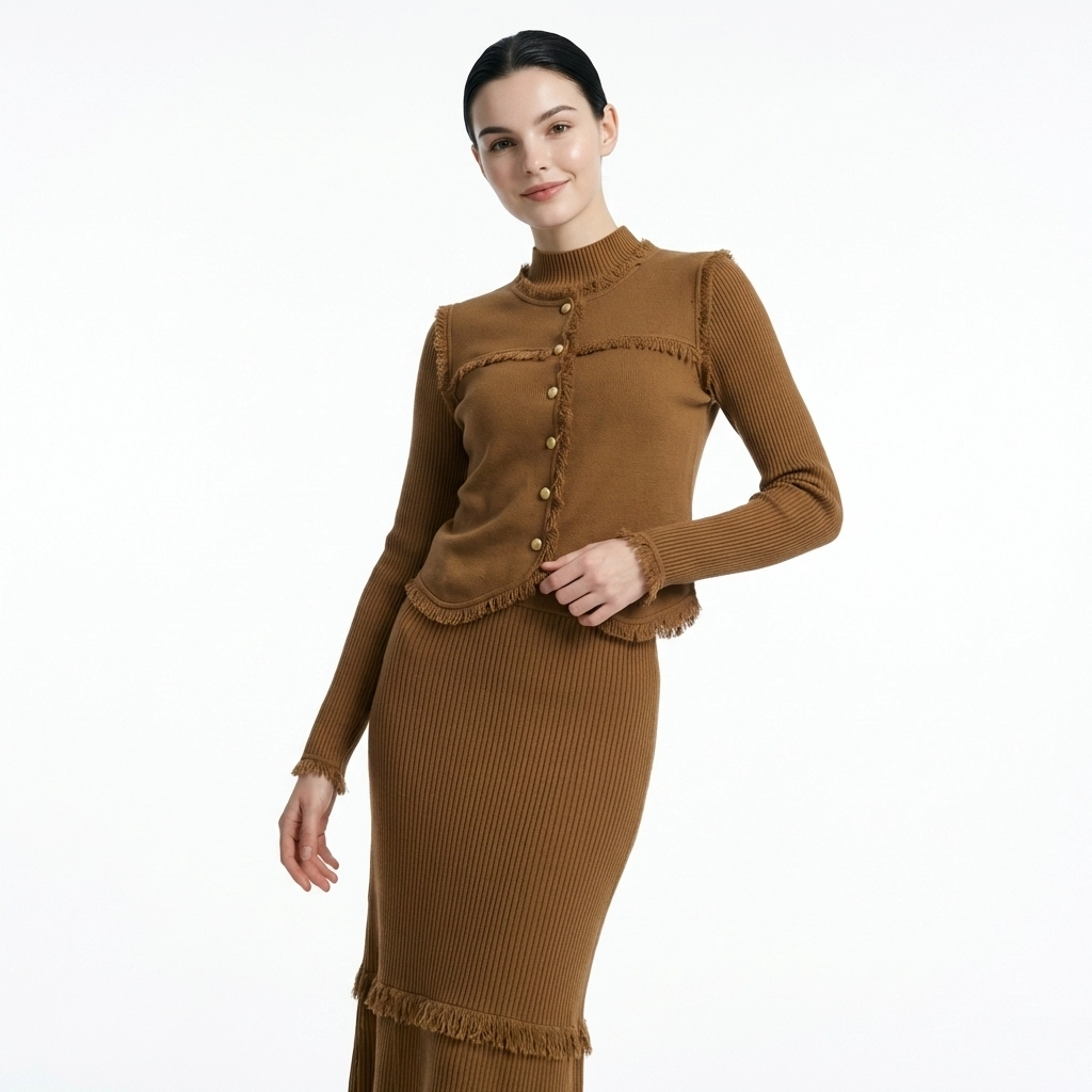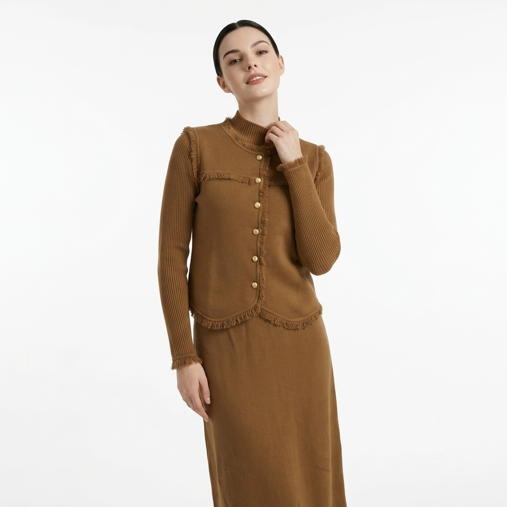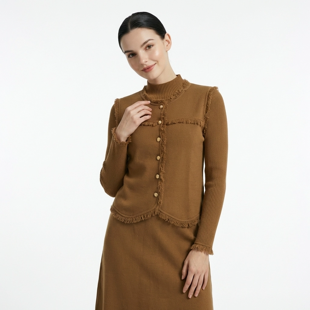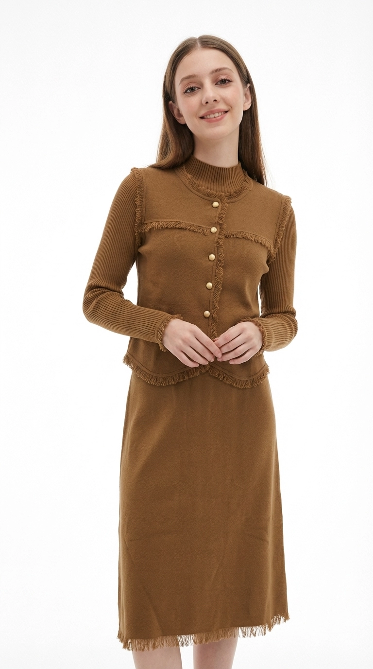 This caramel knit two-piece set centers on vintage fringed details, including a mock-neck long-sleeve inner, a vest, and a midi skirt (or dress). Made of soft knit fabric, it is warm and skin-friendly. The fringed trims on the vest edges, cuffs, and hem, paired with golden metal buttons, retain the gentle texture of knitwear while adding a touch of retro delicacy. It is an elegant choice for commuting and dating in spring and autumn, and can also be mixed and matched to create diverse styles.