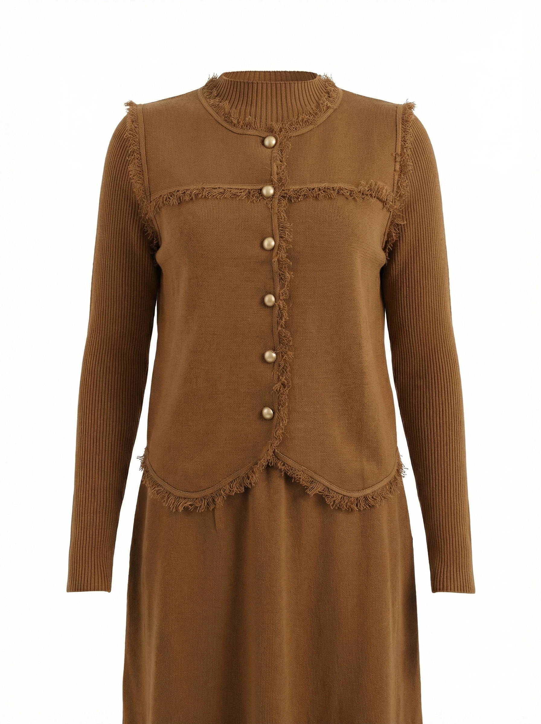 Caramel Fringed Knit Two-piece Set, Vintage Mock Neck Vest + Long Sleeve Dress, Elegant Commute Outfit